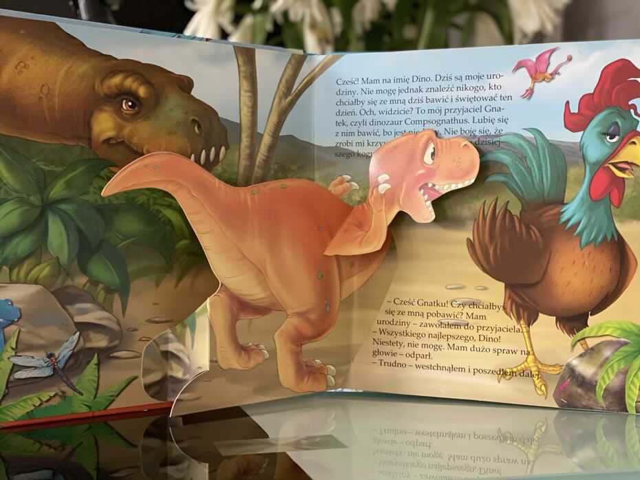 „Niespodzianka dla Dino. Rozkładanki 3D” to krótka i sympatyczna książeczka dla najmłodszych, pokazująca małego bohatera i jego drogę w poszukiwaniu kompana do zabawy. Efektowne obrazki 3D zachwycą niejedno dziecko, a w szczególności miłośnika prehistorycznych, olbrzymich gadów