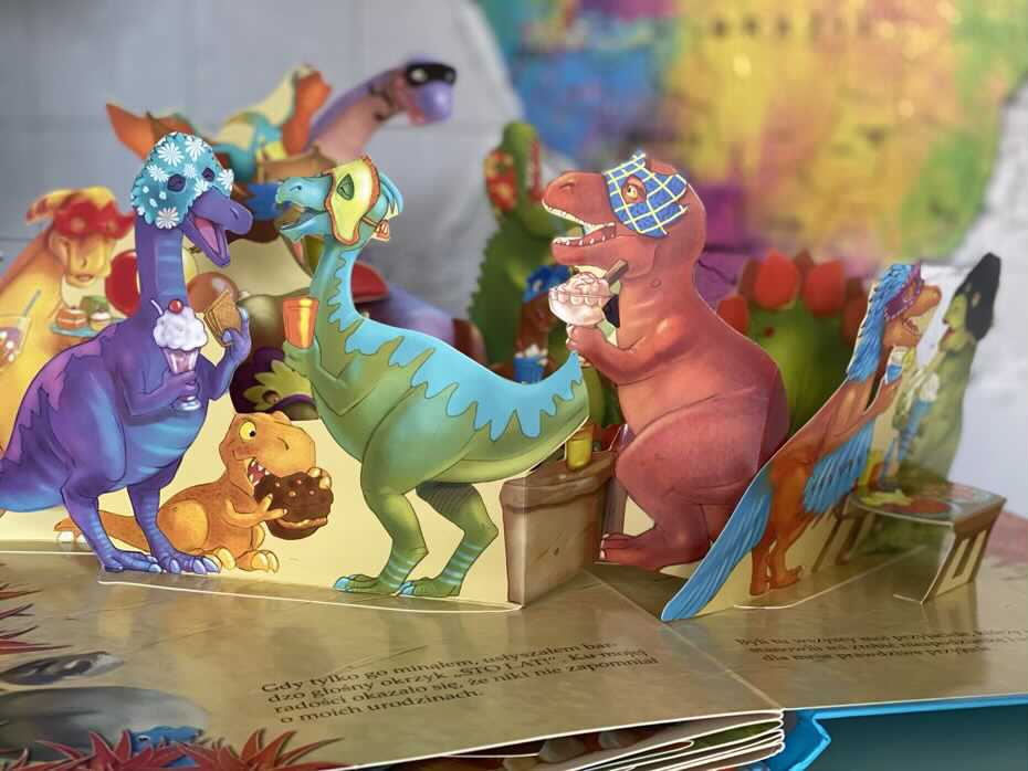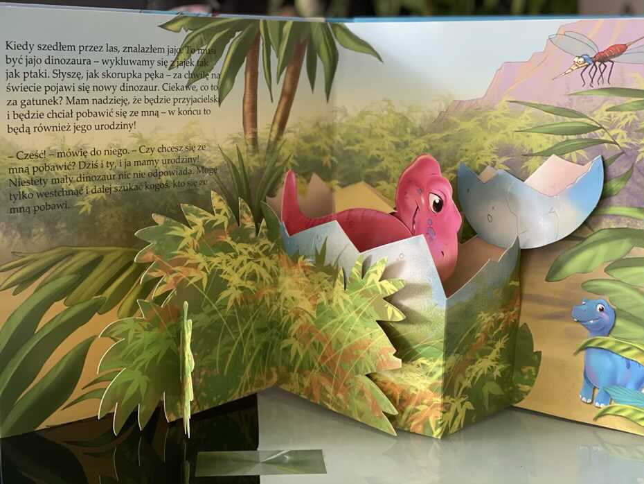 „Niespodzianka dla Dino. Rozkładanki 3D” to kolorowa, trójwymiarowa książeczka, która zabiera dzieci na wędrówkę z młodym bohaterem przez prehistoryczny świat.