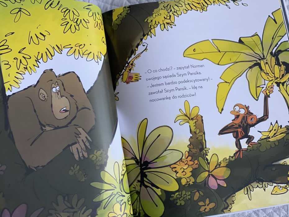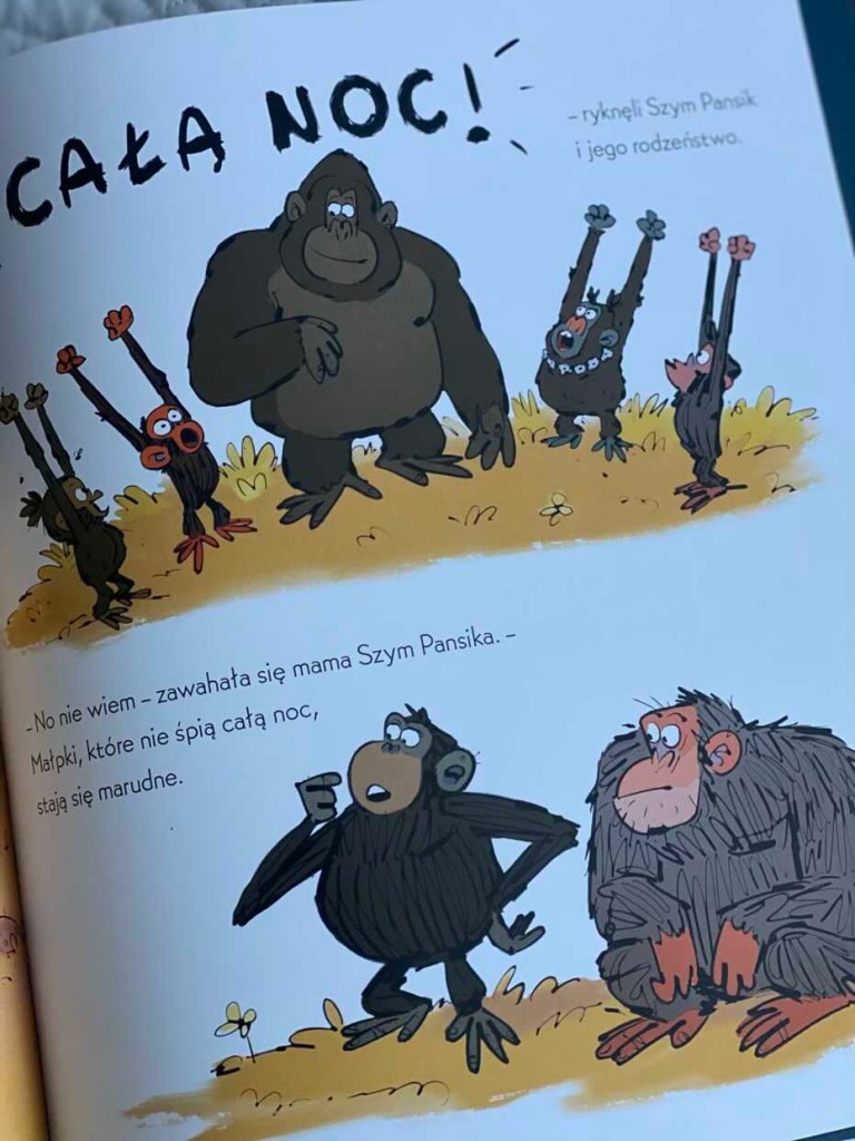 Tytułowy bohater idzie na piżamową imprezę do rodziców. Wie, co go czeka podczas nocowania z rodzeństwem i jest tym bardzo podekscytowany. Nie będzie to tylko łapanie termitów, wyskubywanie pcheł, wyławianie mango z wody, opowiadanie strasznych historii, jedzenie o północy, ale też najbardziej wyczekiwane – nieprzespanie calutkiej nocy!