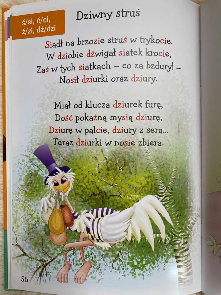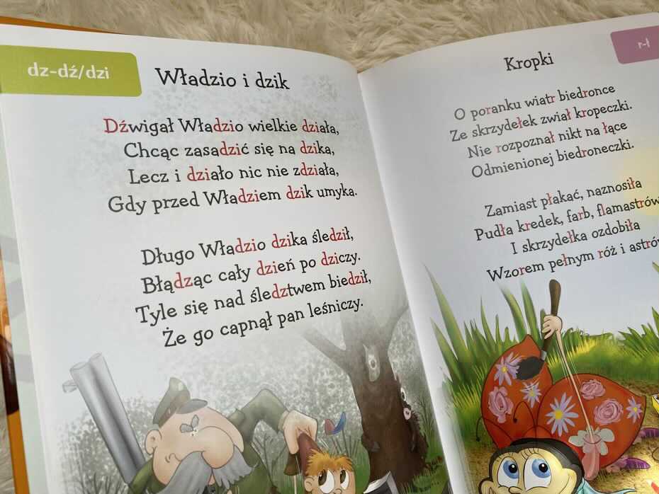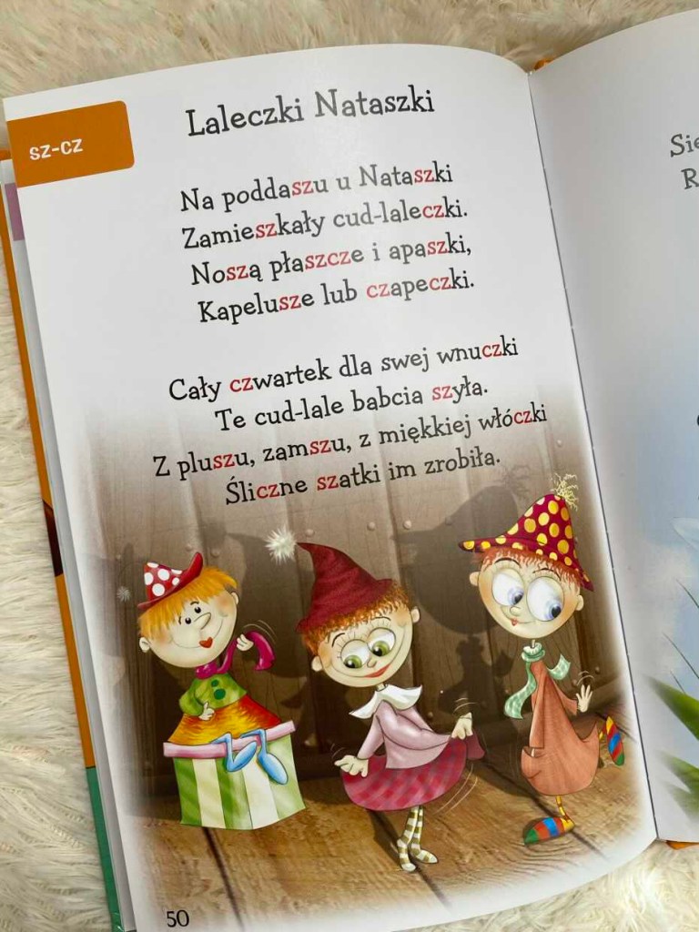 Na każdej stronie w górnym rogu zapisano literę lub literki, o których w wierszu mowa. I to od nas zależy, na której głosce chcemy się skoncentrować i ją przećwiczyć. Wybór jest spory, od znaków alfabetycznych, przez dźwięki szeregu szumiącego (sz, ż, rz, cz, dz, dź, dż) i syczącego (s, z, c, d), po głoski „r” mogące sprawiać trudność na tym etapie rozwoju mowy.