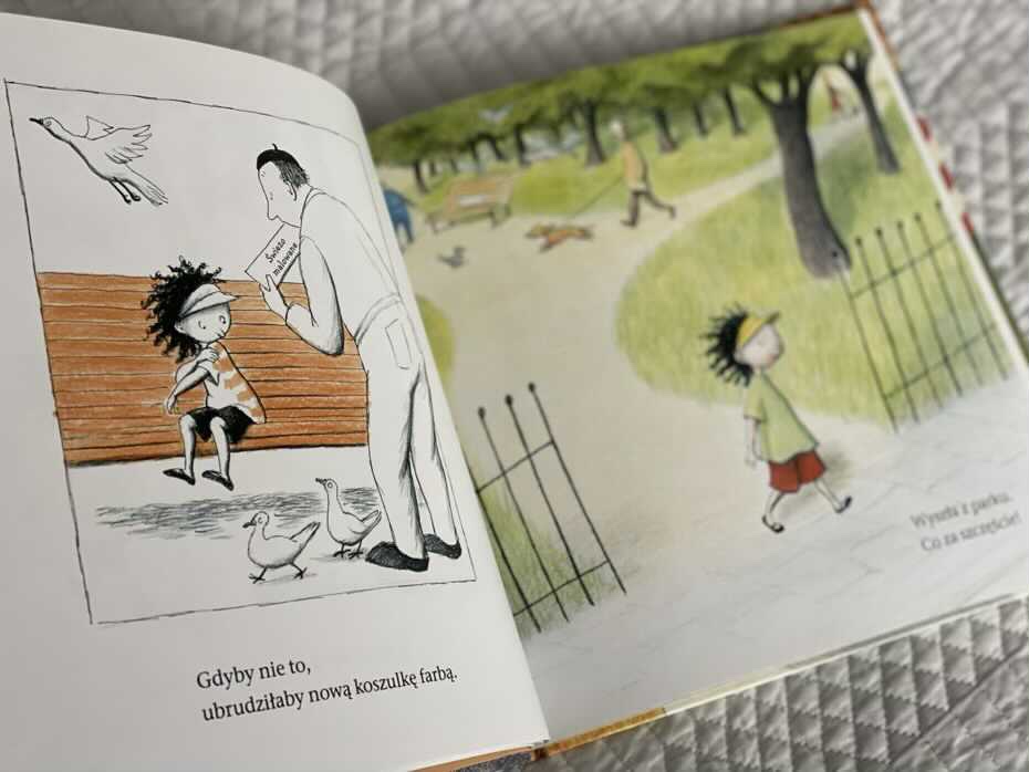 Jakiś czas temu miałam okazję pokazać Wam publikację o podobnej konstrukcji, w której obie historyjki zakończyły się na środkowej rozkładówce. Dokładnie tak samo jest tutaj, mamy dwa tytuły, początki i epilogi, do tego te ostatnie znajdują się w samym centrum lektury. Na stronach jest mało tekstu, ale za to jest sporo sugestywnych ilustracji, które znacznie lepiej oddają emocje towarzyszące poszczególnym zdarzeniom.