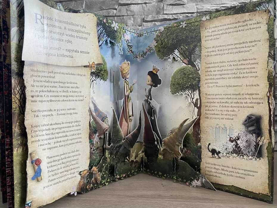 „Królewna Śnieżka” to klasyczna baśń w nowej odsłonie. Ilustracje w tej książce są po prostu urzekające i mają piękne wyskakujące strony, a także grę w poszukiwanie skarbów, która dodaje kolejny wymiar tej opowieści. Dodatkowo znajdziemy tam ukryte niespodzianki: obrotowe koło i otwierane okienka, dzięki którym można poznać sekrety krasnoludków.