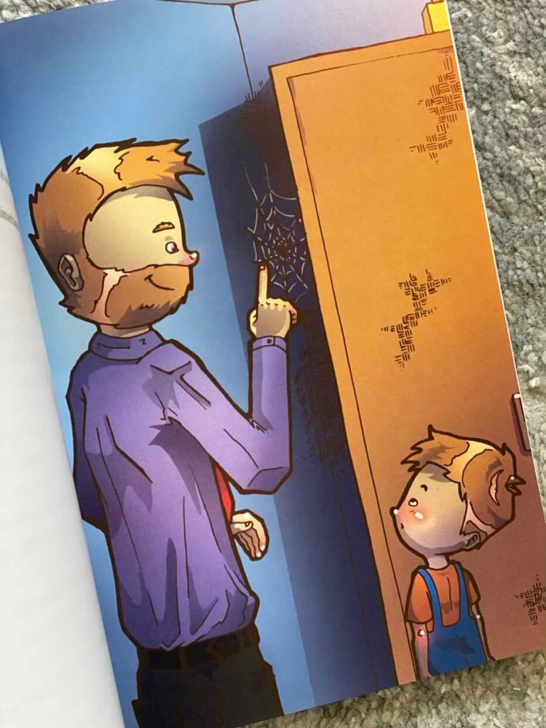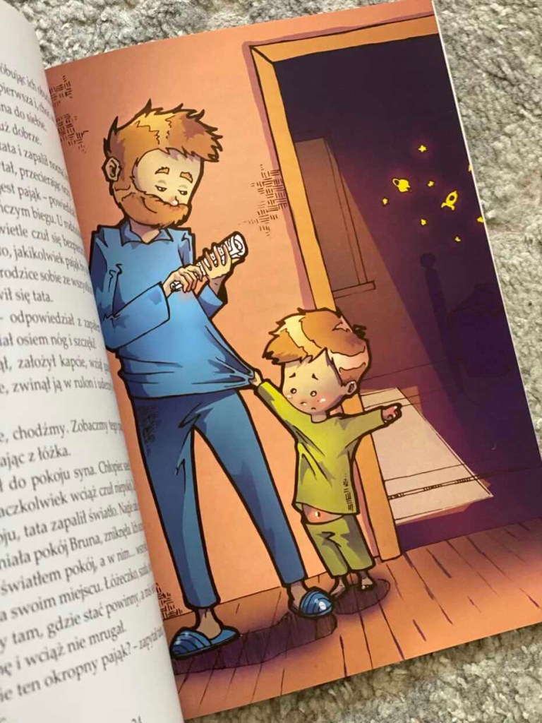 Kiedy zapada noc, Bruno w świetle księżyca dostrzega podejrzany cień na dywanie. Cały dom został postawiony na nogi z powodu nieproszonego gościa. Do akcji wkracza tata ze zwiniętą w rulon gazetą, by pomóc dziecku wrócić do łóżka i zasnąć. Czarna plama, która okazała się pająkiem, zniknęła bez śladu.
