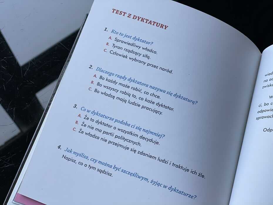 Książkę zamyka „test z dyktatury” oraz zachęta dla młodych czytelników i czytelniczek do nadsyłania odpowiedzi na napotykane gdzieniegdzie pytania, na podstawie których powstanie nowa książka. W ten sposób wszyscy będą mogli się dowiedzieć, co o tych sprawach myślą dzieci.
