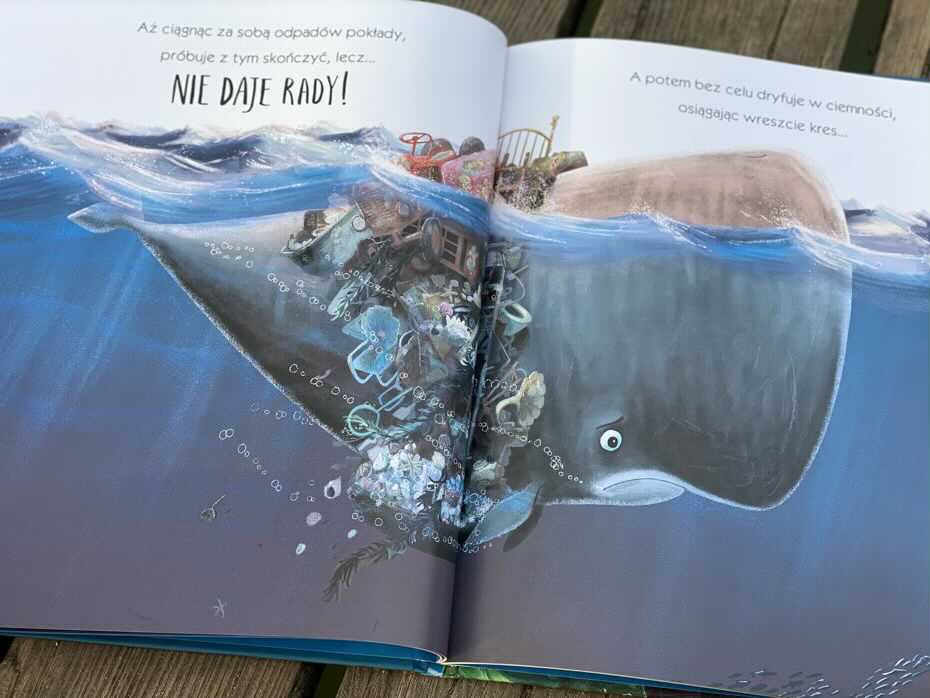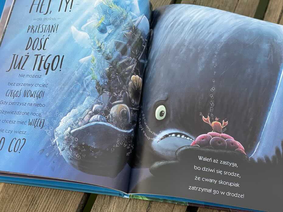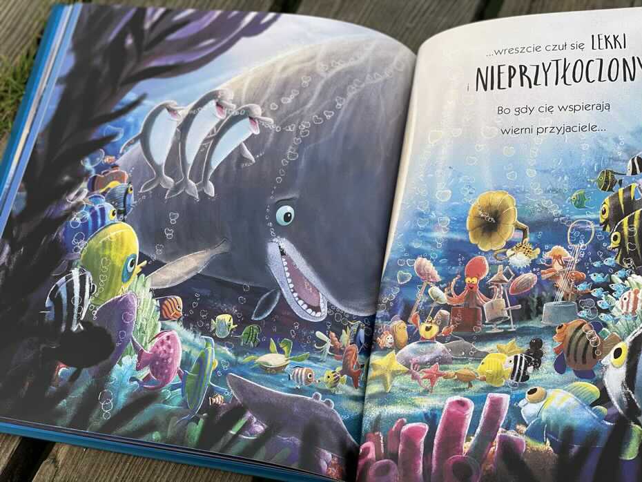 Ilustracje są bajeczne i każda rozkładówka jest pełna kolorów. Jest mnóstwo zdjęć, nad którymi można się zatrzymać i zastanowić, o czym dana postać myśli i co czuje, rozwijając w ten sposób empatię. Wspaniale jest widzieć tego ogromnego wieloryba, który jest wrażliwy, a następnie odnajduje przyjaźń i zadowolenie z najprostszych rzeczy.