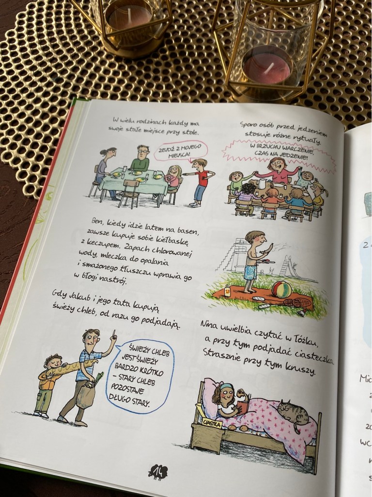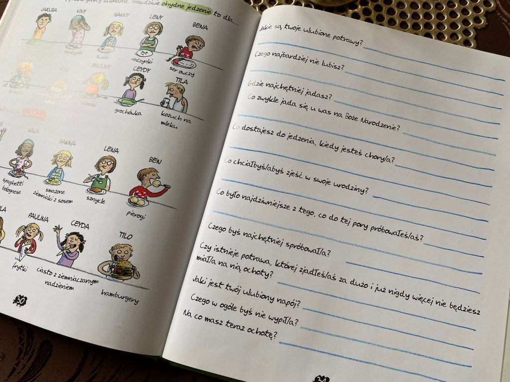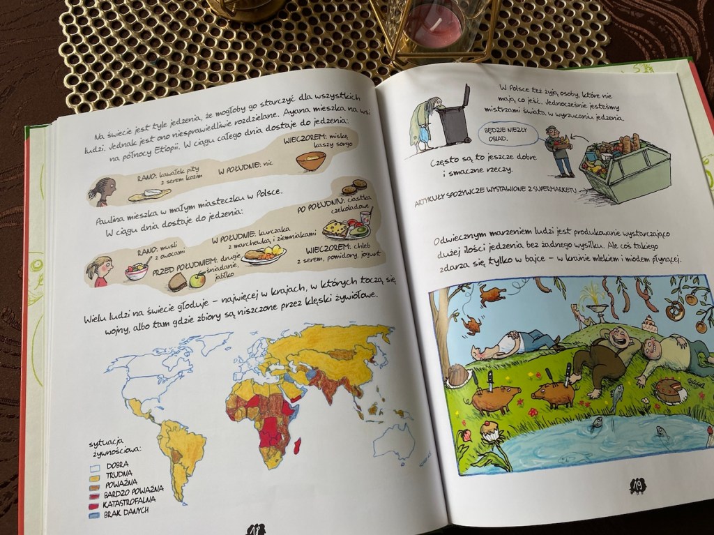 Ponadto książka tłumaczy ważne zjawiska społeczne, takie jak marnowanie żywności czy sytuację żywnościową na całym świecie. Ostanie strony zabiorą dzieci do zabawy w odgadywanie smaków, a na sam koniec lektura pokaże, jak różne gusta kulinarne mają najmłodsi i zapyta czytelników o ich własne doświadczenia.