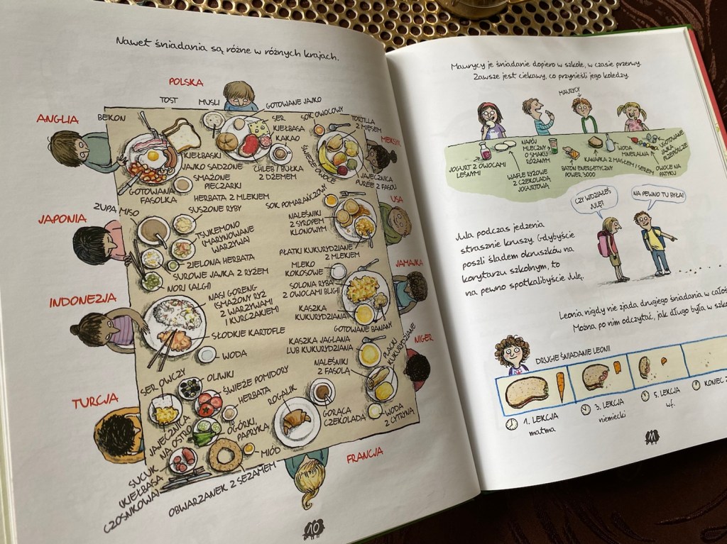Publikacja w swobodny i pełen humoru sposób przestawia małym odbiorcom informacje o naszym jedzeniu. Na stronach znajdziemy mnóstwo różnorodnych przykładów zachowania i zwyczajów żywieniowych, również tych niewłaściwych, które często popełniają rodzice. Młodzi czytelnicy mogą porównać swoje śniadanie z daniami innych dzieci mieszkającymi w różnych rejonach świata. Najmłodsi mogą zobaczyć zasady zachowania przy stole i dowiedzieć się, dlaczego są inne, zależnie od kraju.
