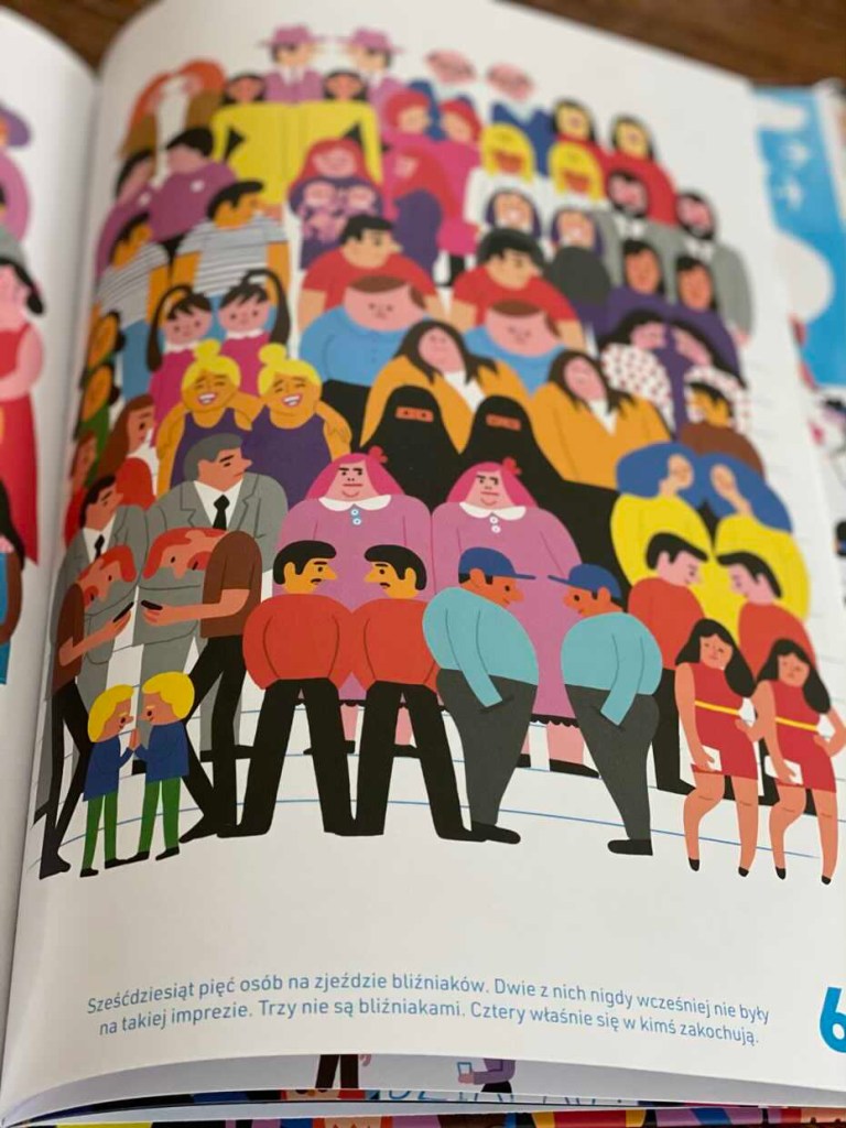 Książka zawiera 2768 indywidualnie narysowanych osób. Zaczynamy od jednej osoby, później pojawiają się dwie, trzy, pięć, dziesięć, pięćdziesiąt, sto i tak aż do całego globu. Zadaniem małych czytelników jest odnaleźć na ilustracjach bohaterów, których opisuje krótki tekst pod obrazkiem. Postacie w książce są bardzo zróżnicowane, co sprawia, że czytanie jest wyjątkowo przyjemne.