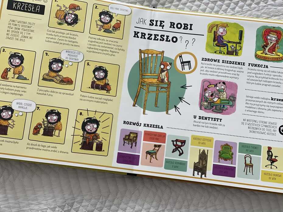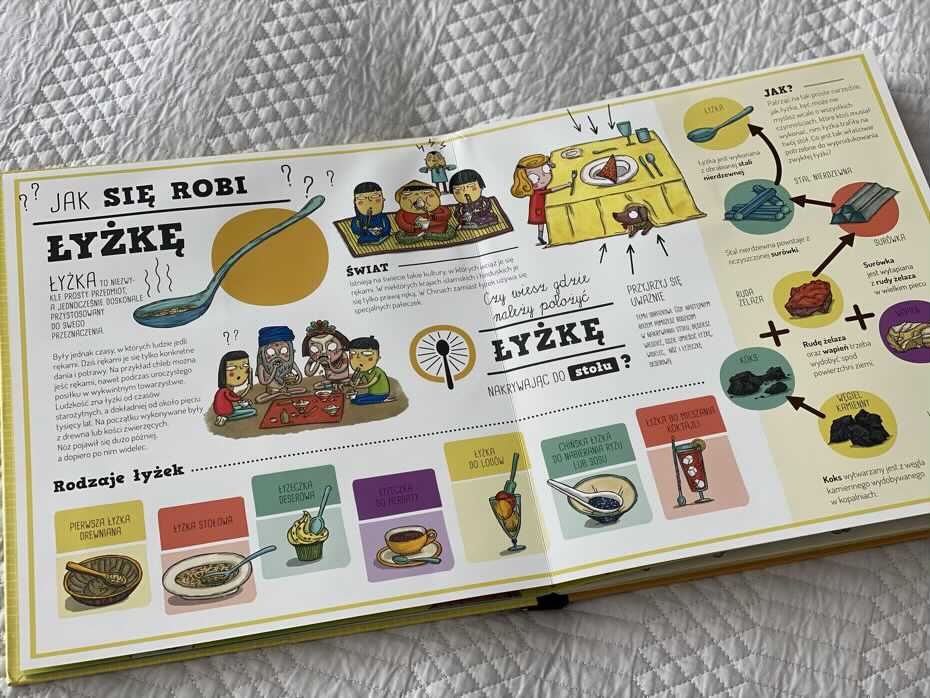 Czy wiesz, jak powstaje łyżka, chleb, podkoszulka, szklanka, krzesło lub książka? Każdy przedmiot przedstawiany jest na dwa sposoby. Przede wszystkim poświęcona mu jest podwójna rozkładówka z anegdotami na temat jego historii. Następnie strona rozwija się, oferując infografikę XL, która śledzi produkcję od A do Z, ze zintegrowaną ścieżką, krokami, ilustracjami i broszurami wyjaśniającymi.