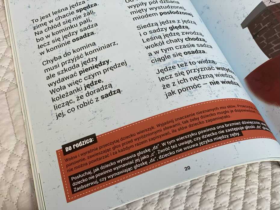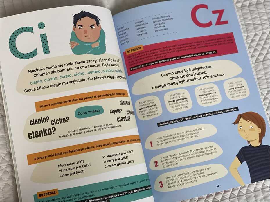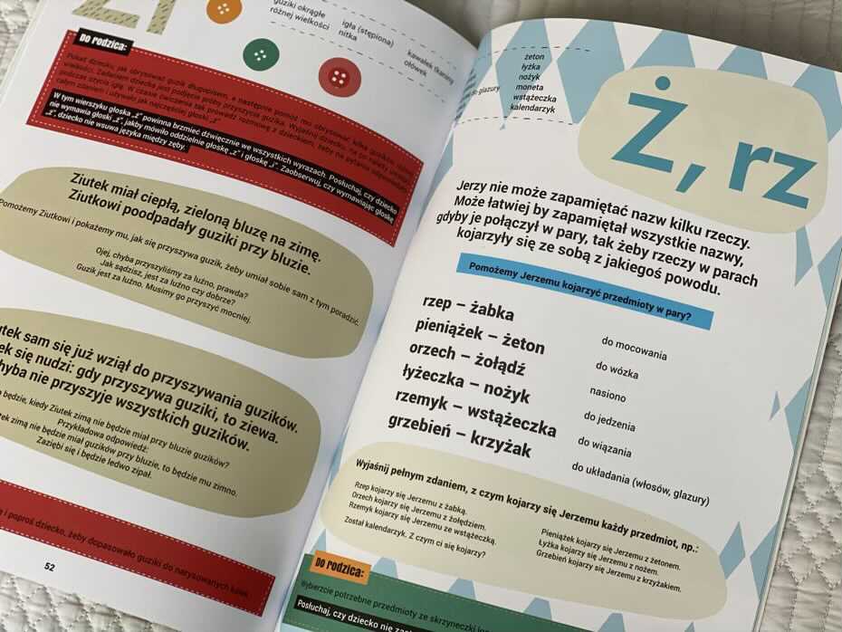 Na samym początku autorzy proponują skompletowanie bardzo oryginalnej pomocy naukowej do ćwiczeń wymowy – „Skrzyneczki logopedycznej”. Bez obaw – większość stanowią przedmioty, które są w każdym domu. Już samo to jest świetną zabawą, która wzbogaca słownictwo i uczy planowania.