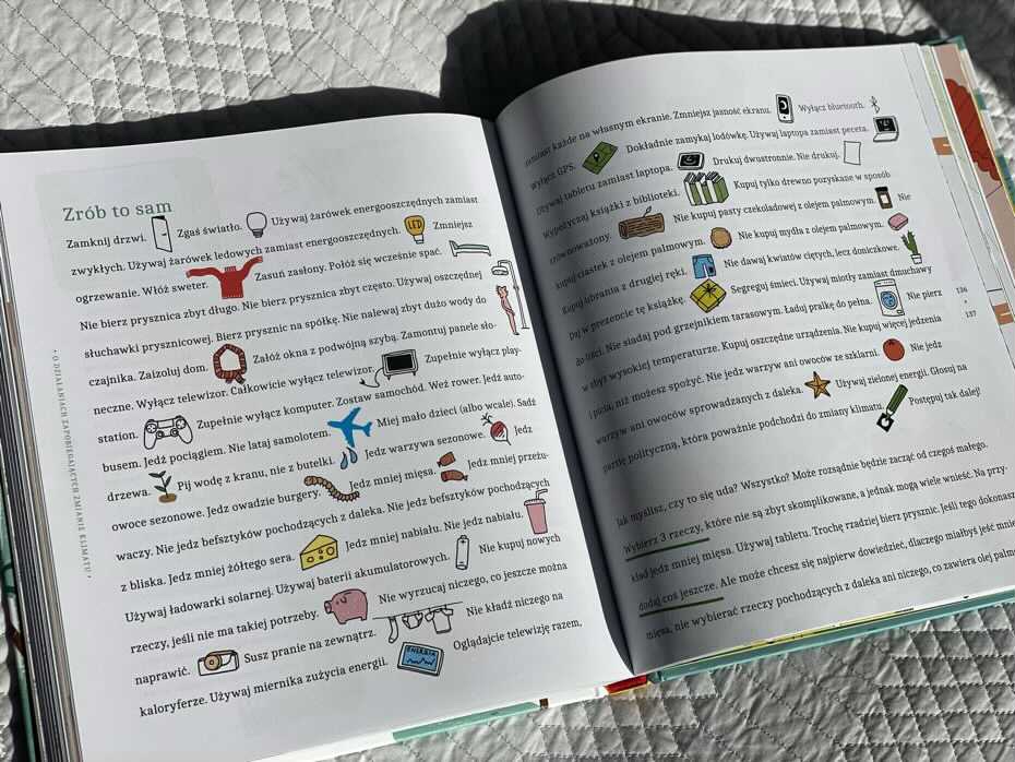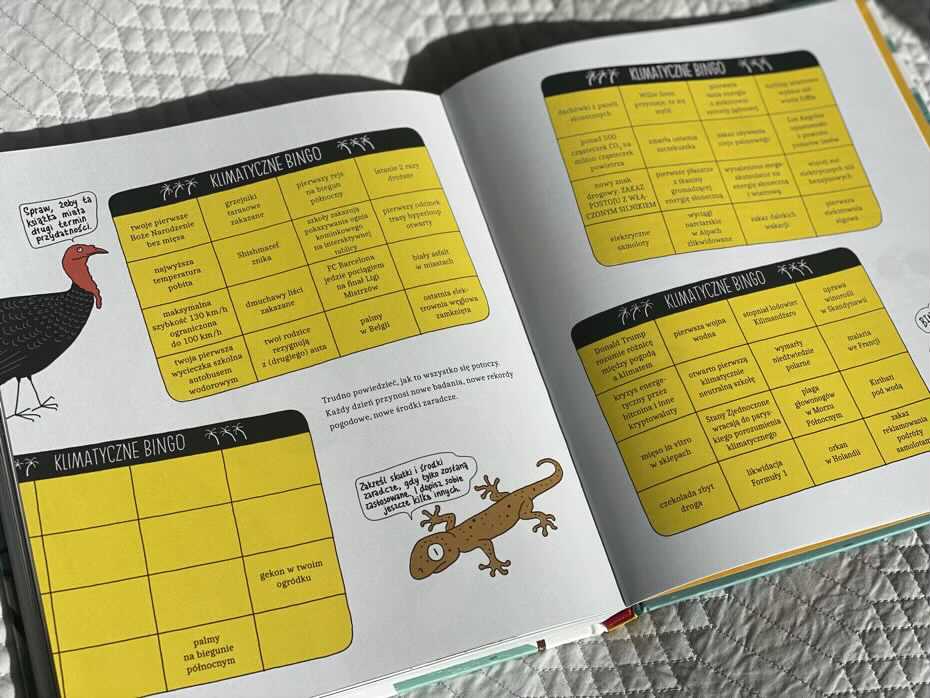 Klimatyczne bingo na końcu lektury będzie stymulować i rozwijać świadomość m.in. codziennych działań oraz tego, czy i jakich używać produktów. To, co można zrobić samemu w zakresie poprawy klimatu, jest wymienione punkt po punkcie pod nagłówkiem „Zrób to sam”. Autor daje wskazówkę, aby zacząć od małych rzeczy, wybierając na przykład trzy punkty, a następnie je rozszerzając.