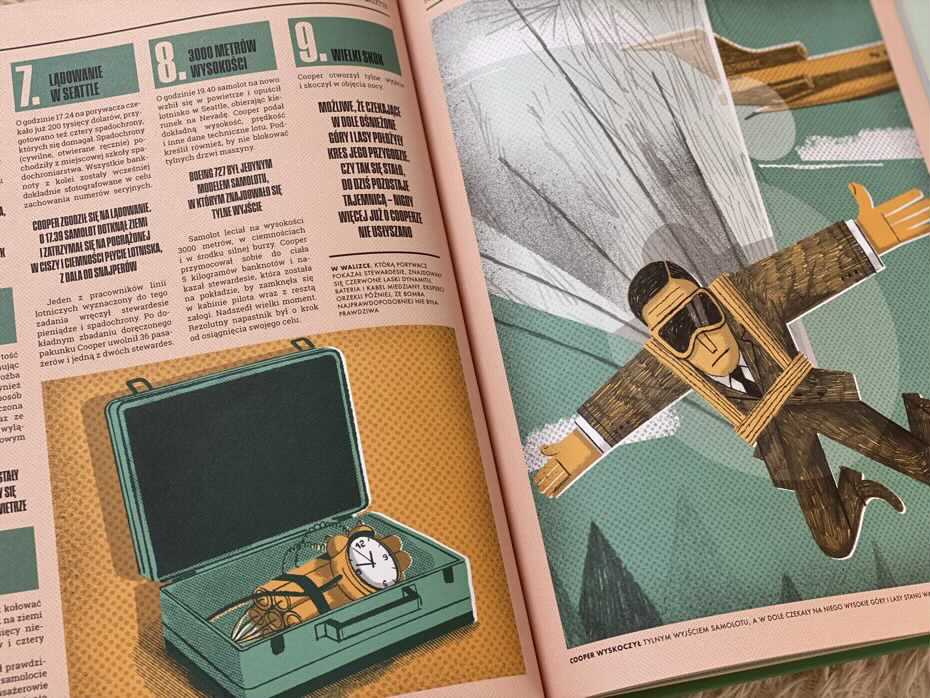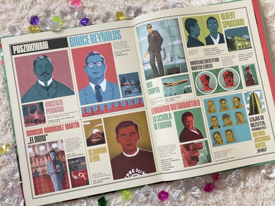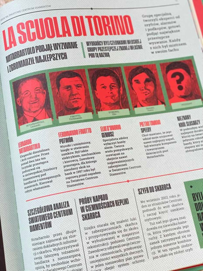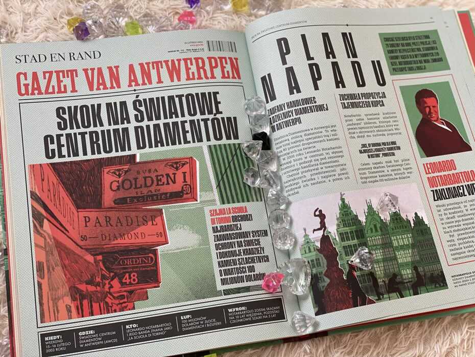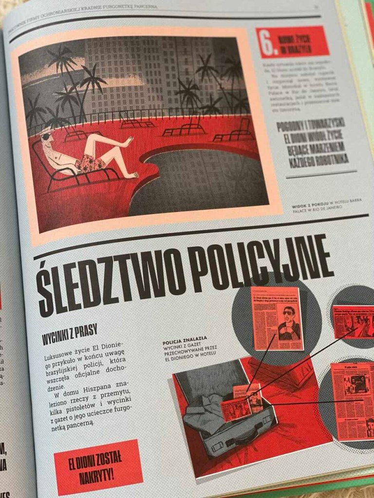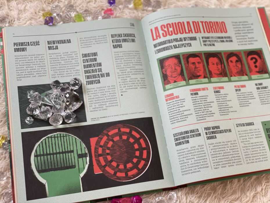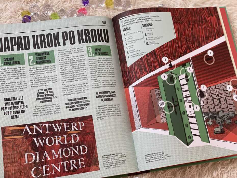 Każdy rozdział poświęcony jest konkretnemu napadowi i zaczyna się od pierwszej strony gazety miejskiej z dużym nagłówkiem. Przedstawia zaskakujące szczegóły dotyczące planowania, przeprowadzania rabunków i późniejszego śledztwa policyjnego. Ilustracje cieszą się u nas w domu dużym powodzeniem. Znajdują się tu infografiki objaśniające, mapy i sekcja, która zachwyci każdego dziennikarza, czyli słynne pytania, które można zadać o wszelkich wydarzeniach: kto, gdzie, kiedy. Opisano tu również przeprowadzone śledztwa policyjne i dowiadujemy się, czy zakończyły się one sukcesem.