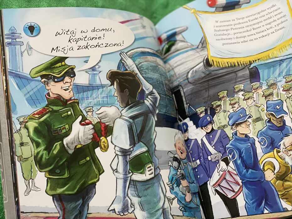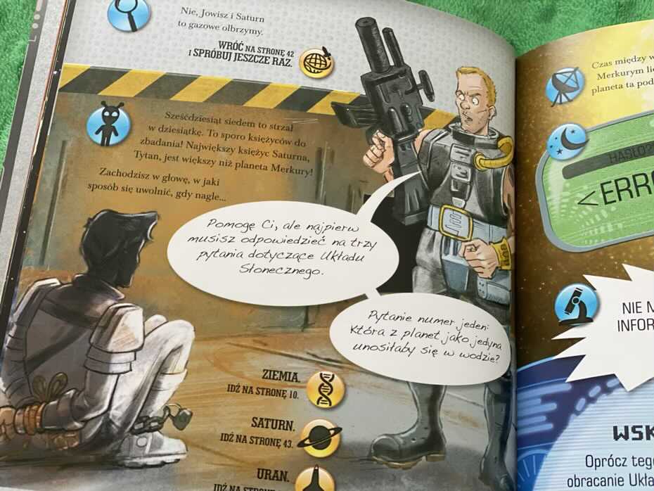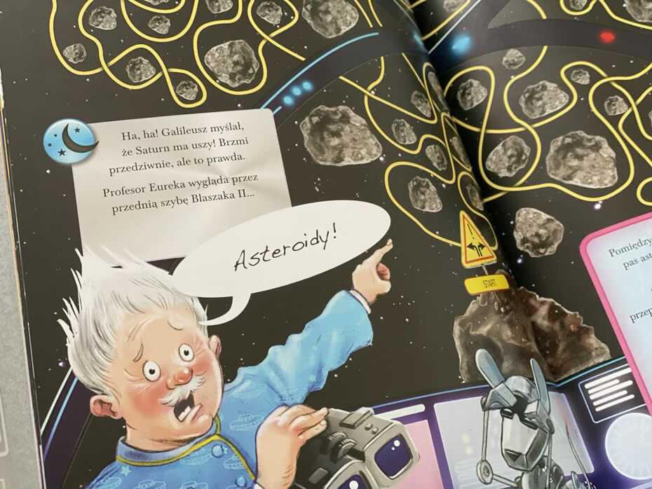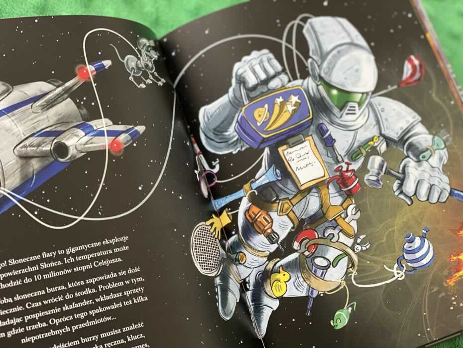 „Zagubieni w kosmosie” to coś więcej niż wiedza o kosmosie. To zabawa, w której dziecko podejmuje decyzje. Nawet jeśli odpowiedź jest nie poprawna, zostanie ono odesłane do pytania i nakierunkowane na właściwy tor. Świetna sprawa, ponieważ czytelnik uczy się na swoich błędach i zapamiętuje poprawne informacje. Jeśli szukacie czegoś innego niż tylko książki o kosmosie i układzie planetarnym, ta będzie strzałem w dziesiątkę. My ją polecamy.