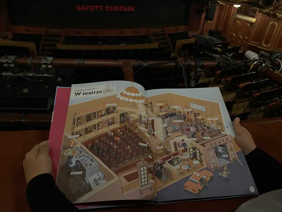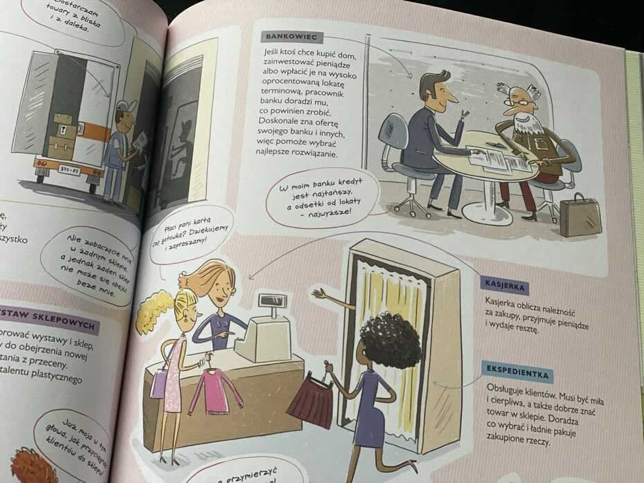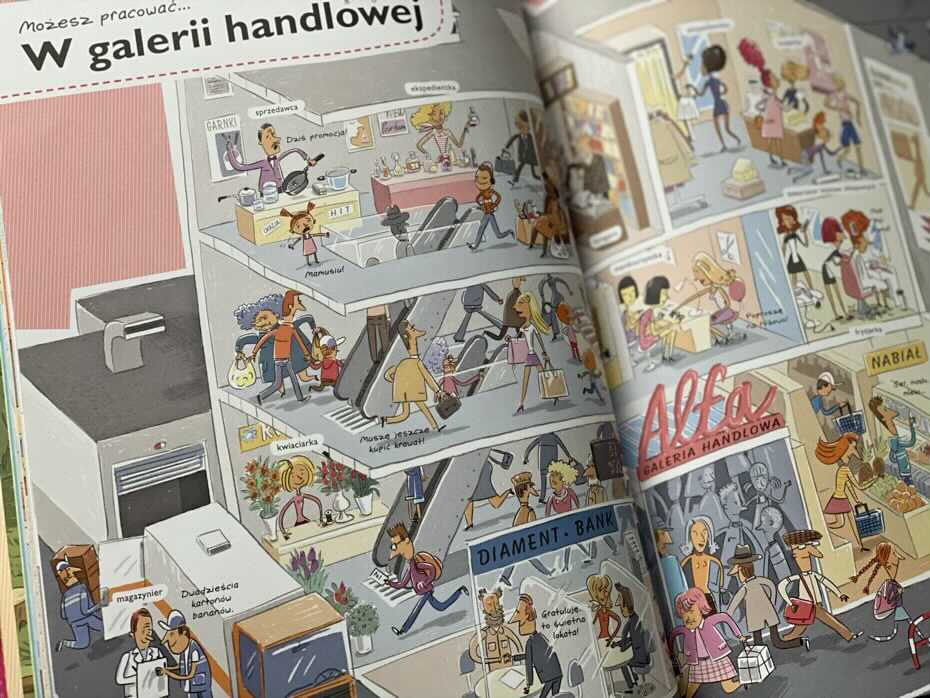 Przedstawione miejsca pracy i zawody są wyposażone na kolejnych stronach w dodatkowe scenki, opisy oraz ciekawe informacje o wybranych profesjach. Ilustracje są kombinacją rzutów z przekrojami, więc możemy zaglądać do wielu pomieszczeń i patrzeć kto w nich pracuje. Natomiast kolejna rozkładówka opisuje wybrane zawody z poprzedniego tematu.
