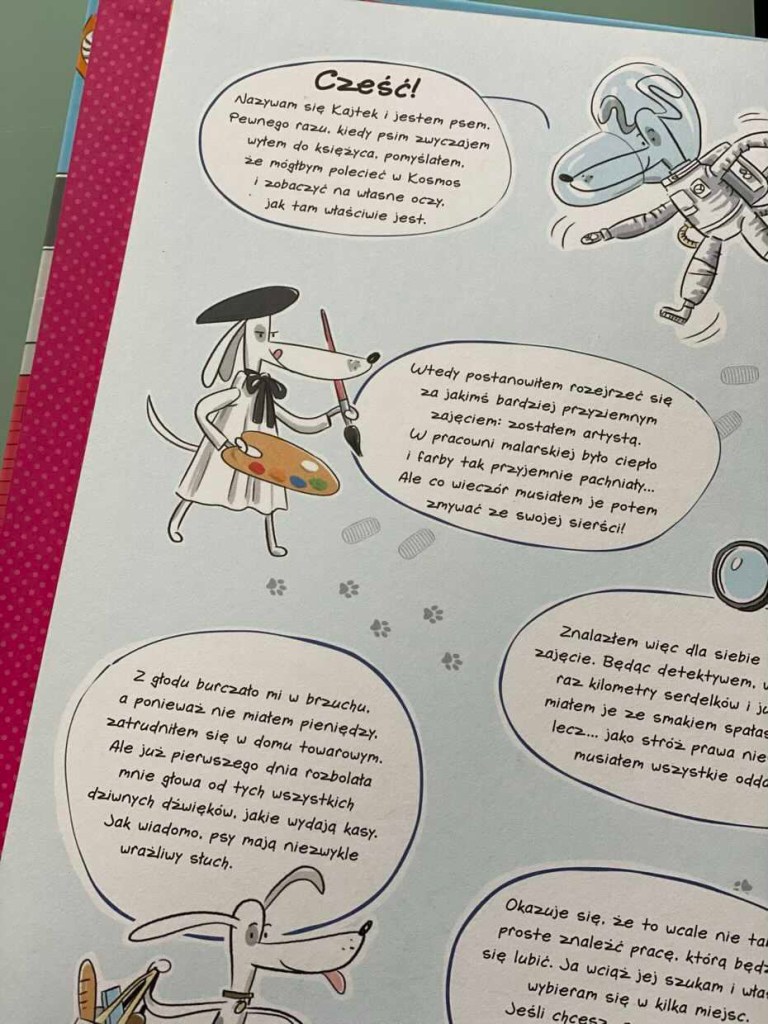 Naszą czytelniczą podróż rozpoczynamy od poznania psa przewodnika. Natomiast po kolejnych stronach oprowadza nas czworonóg Kajtek, którego możemy próbować odszukać na wszystkich rozkładówkach.