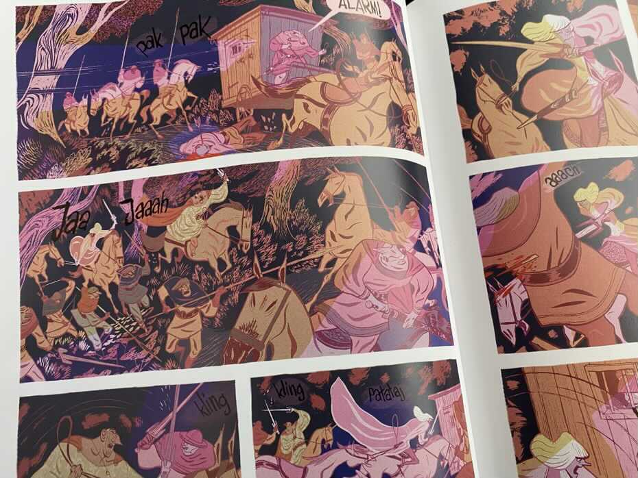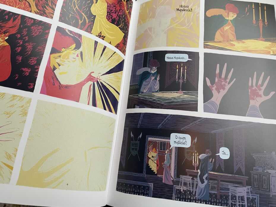Atutem tej książki był dla mnie wyjątkowy i piękny styl rysowania. Kreska i kolory są tak idealnie zespolone, że każdy kadr urasta tu do rangi miniaturowego dzieła sztuki. Złowieszcze, niebieskie i fioletowe strony, agresywne, płomienne, czerwone i pomarańczowe strony oraz wyblakły róż i krem tworzą bardzo różne i ekstremalne nastroje.