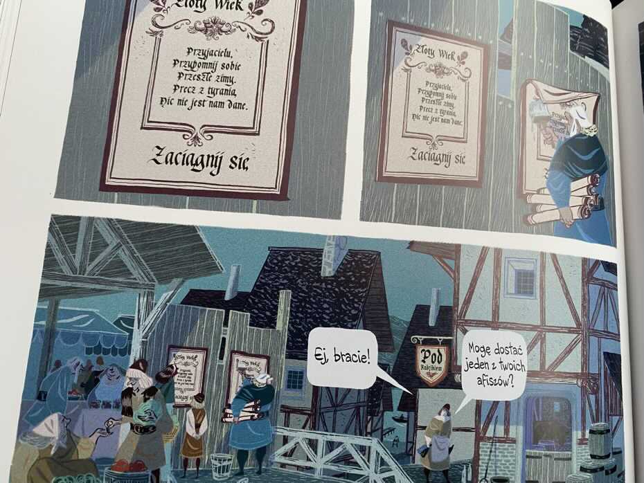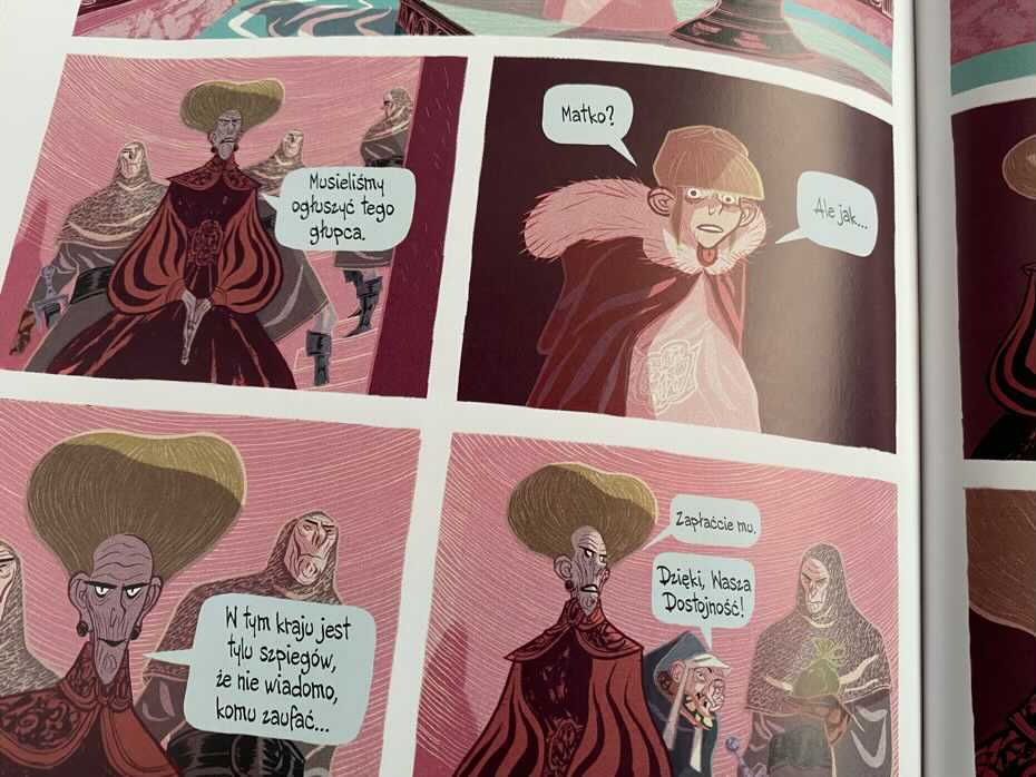 „Złoty Wiek – Część 1” to historia Tildy i jej dwóch wiernych towarzyszy, którą czyta się jak scenariusz filmowy. Jest tu wiele postaci i na początku kilka wątków, które trzeba śledzić, ale wszystko zaczyna się łączyć w całość. Fabuła jest dobra, wyraźnie buduje świat i historię w scenerii przypominającej średniowieczną Francję. Zważywszy na język, polecam komiks starszym czytelnikom, choć mój niespełna 7-latek słuchał go w wielkim skupieniu. Czytając, pozwoliłam sobie nieco zamienić słownictwo na mniej kojące w oczy. Wkrótce pokażemy kontynuację tej niezwykłej opowieści.