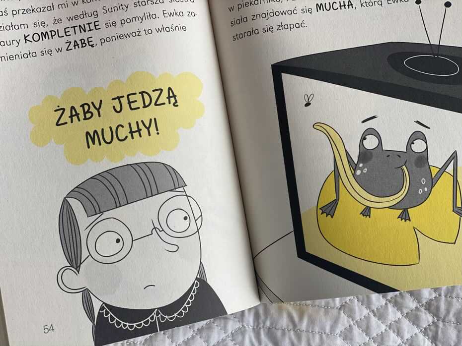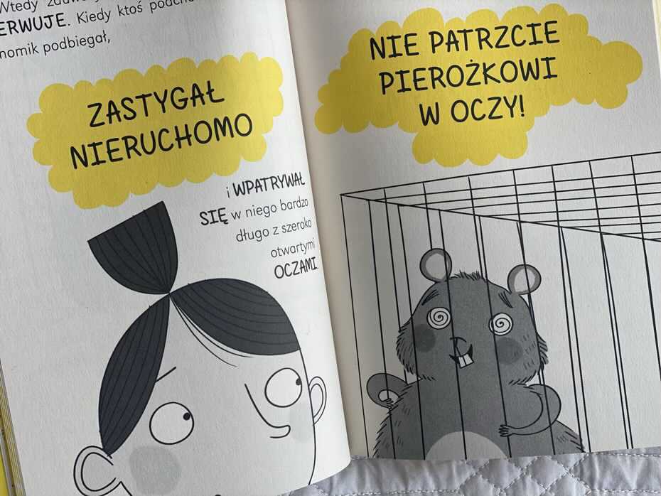 Książeczka podzielona jest na niezbyt długie rozdziały. W tytułowej pierwszej części czytelnicy dowiedzą się, jak Pierożek hipnotyzuje dzieci. W drugiej, jak Ewka połknęła mychę i przybiera zielonkawy kolor żaby. Ostania historyjka dotyczyć będzie Maksa i jego tajemniczego plecaka. Aby nie zdradzać za dużo szczegółów, powiem tylko, że pomysłowość uczniów klasy 2b jest niezwykła. To, w jaki sposób podchodzą do zagadek, jest przezabawne.