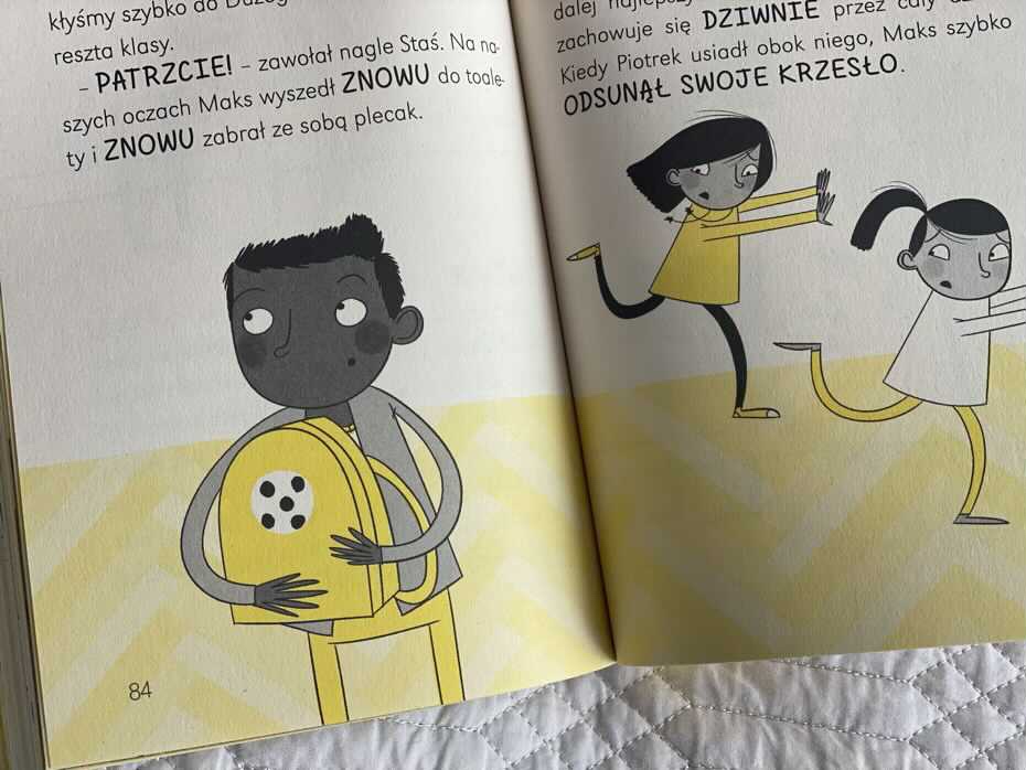 Każdy tomik skrywa w sobie trzy krótkie historyjki. Każda z nich dzieje się na terenie szkoły z udziałem uczniów klasy 2b. Niekiedy pojawią się dodatkowe osoby: nauczycielka p. Riley i pan Harris. Szata graficzna utrzymana jest minimalistycznie w kilku kolorach. Co ciekawe każdy tytuł ma niepowtarzalny kolor okładki i właśnie on pojawia się na stronach w danej części lektury. „Magiczny chomik” jest żółtawy i każda kartka także ma taki odcień. Co bardzo lubię podczas czytania tekstu, to pogrubione słowa – wyrywkowo proszę Adasia o ich wypowiedzenie. W ten sposób sprawdzam jego uwagę i poprawną wymowę.