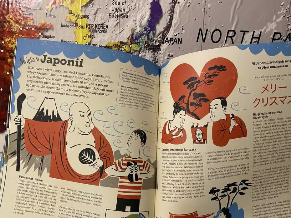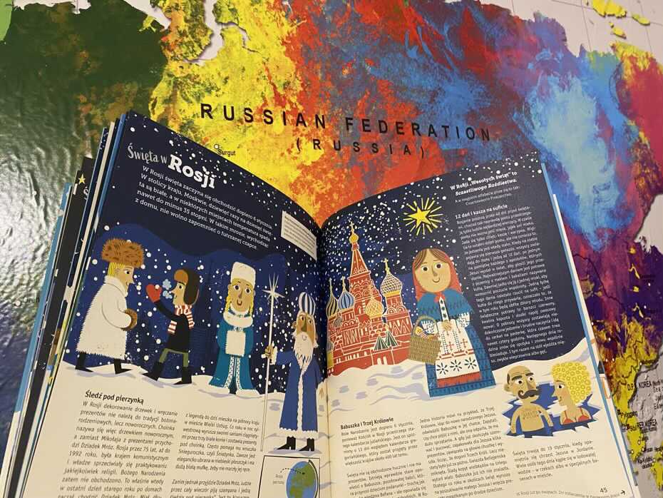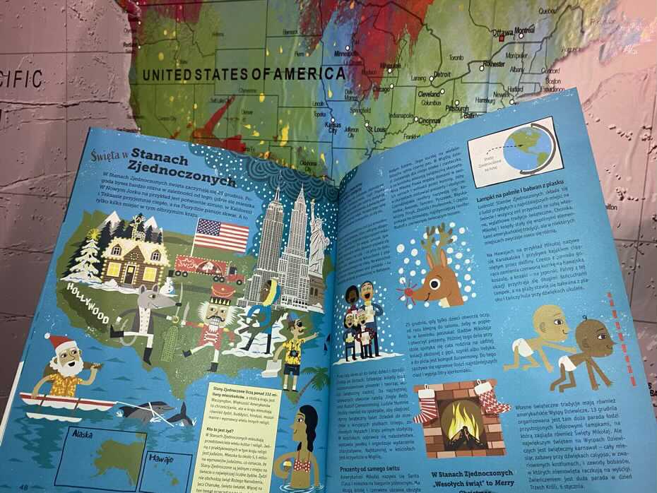 „Święta na świecie” to inspirująca książka dla dzieci, która zawiera wiele faktów o grudniowym świętowaniu.