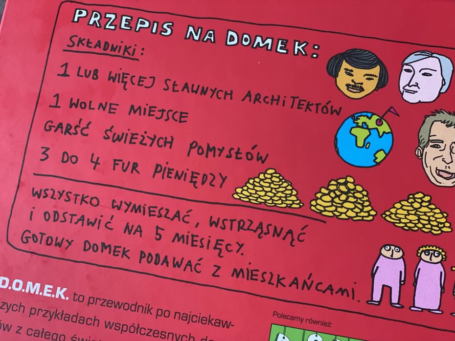 „D.O.M.E.K.” to zabawna książka identyfikująca architekta i lokalizację każdego z 35 prezentowanych domów (z których większość znajduje się w Europie) i zachęca czytelników do wykazania się kreatywnością.
