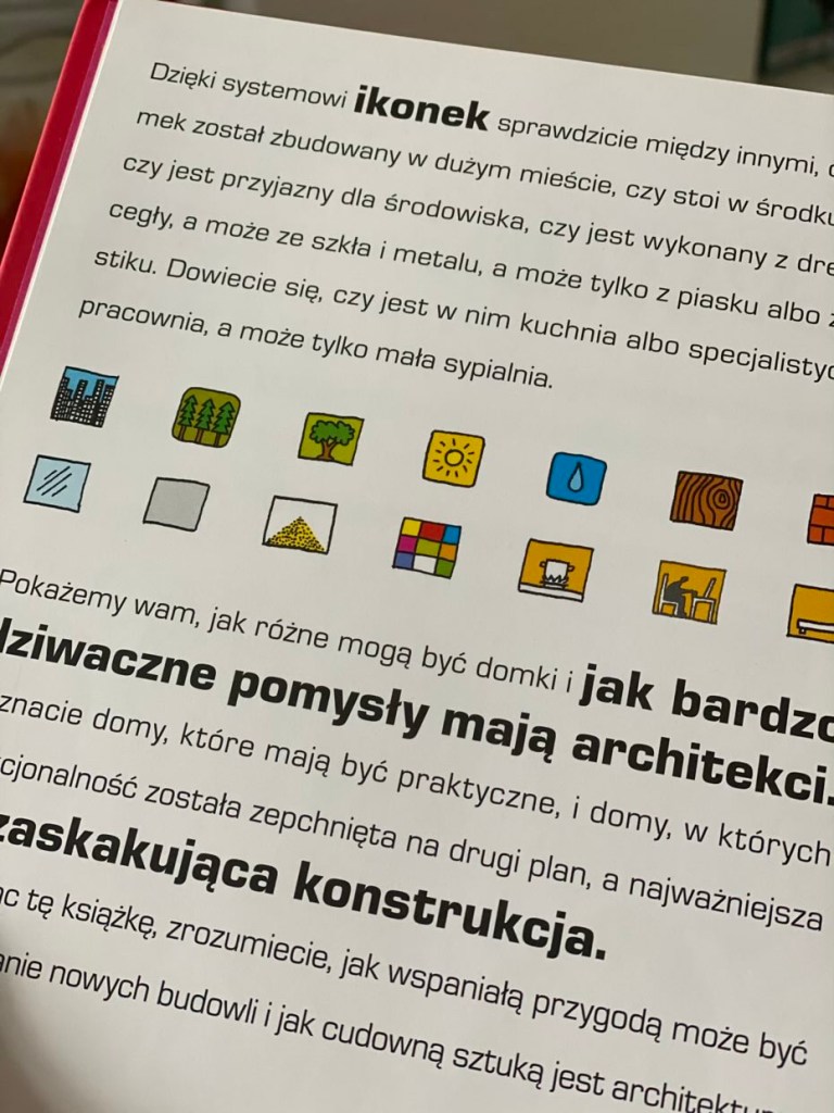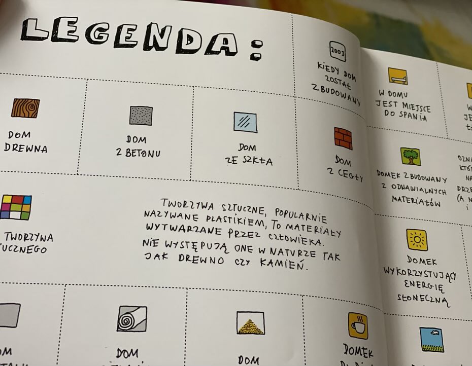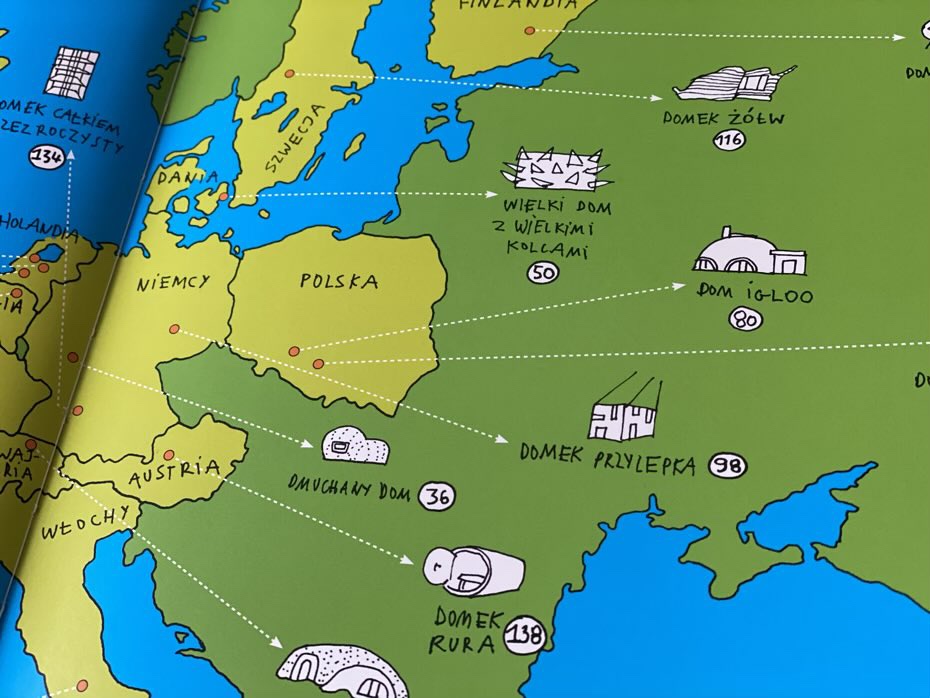 Już na początku autorzy objaśniają, czym jest domkologia, wyjaśniają system pojawiających się ikon, które czytelnik znajduje po prawej stronie każdej pierwszej rozkładówki z nowym domem. Na pierwszy rzut oka można powiedzieć, kiedy i gdzie dom został wybudowany, jakich materiałów użyto, jakie funkcje może pełnić oraz czy wykorzystuje energię słoneczną lub zbiera wodę deszczową. Następnie odbiorca widzi na mapie Europy i Świata małe rysunki budowli i numery stron, gdzie jest ona ulokowana. Natomiast na deser autorzy dołączyli przepis na własny domek. Może się skusicie?