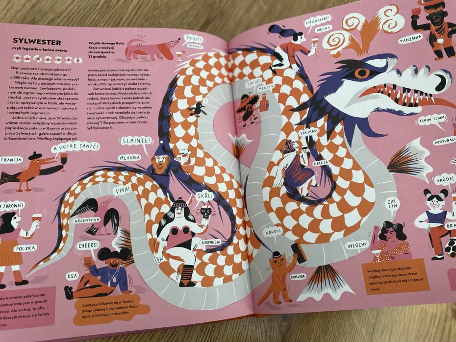 Nie tylko jest tu mowa o hucznie obchodzonym Sylwestrze, mokrym śmingusie-dyngusie, Święcie Szałasów, fieście na cmentarzu w Meksyku, Festiwalu Róż, ale i mniej znanych Pow Wow, Miripôh czy choćby Surwa. Wszystkie 24 prezentowane święta opisane są w lekki sposób, ale z wielkim impetem.