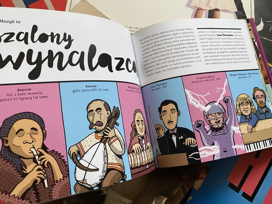 Czytelnicy na stronach spotkają nie tylko aktywnych muzyków, ale także artystów i eksperymentatorów z dźwiękiem np. amerykańskiego kompozytora Johna Cage’a, który twierdził, że „wszystko jest muzyką”, ponieważ dźwięków nie da się podzielić na mniej i bardziej muzykalne. Marka Bainera, który posługuje się specjalnymi instrumentami, aby nagrywać dźwięki wewnątrz konstrukcji budynku, a następnie odtwarza je na koncertach. Wolfganga von Kempela, który zbudował mówiącą maszynę. Karlheinza Stockhausena, który wymusił kwartet skrzypcowy do grania dźwięków helikopterów przelatujących nad salą koncertową. Briana Eno jako przykład muzyka niekoniecznie kończącego szkołę muzyczną, która ma wpływ na rozwój muzyki na całym świecie. Maxa Neuhausa, który twierdzi, że zwracamy większą uwagę na to, co widzimy niż na to, co słyszymy. Leona Thèremina, który zbudował pierwszy na świecie instrument elektroniczny, czy Aloisa Hábu, czeskiego kompozytora, który pomógł zbudować unikalny fortepian ćwierćtonowy wystawiony dziś w Muzeum Czeskim muzyki.