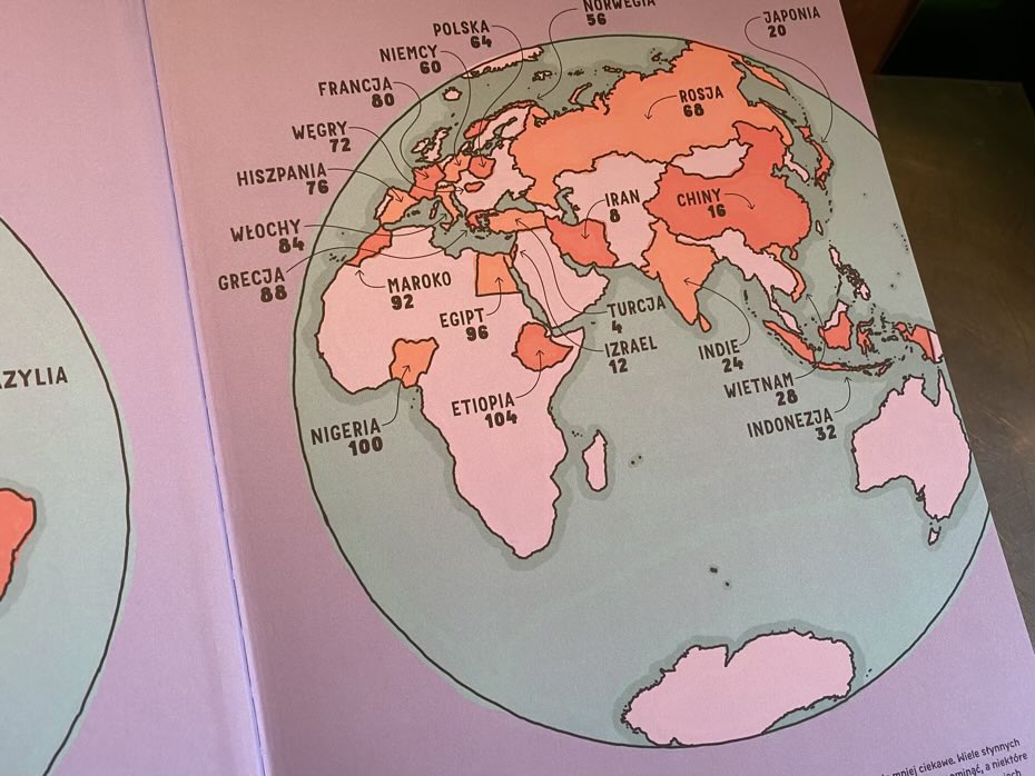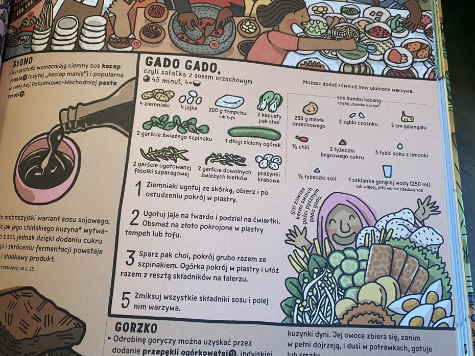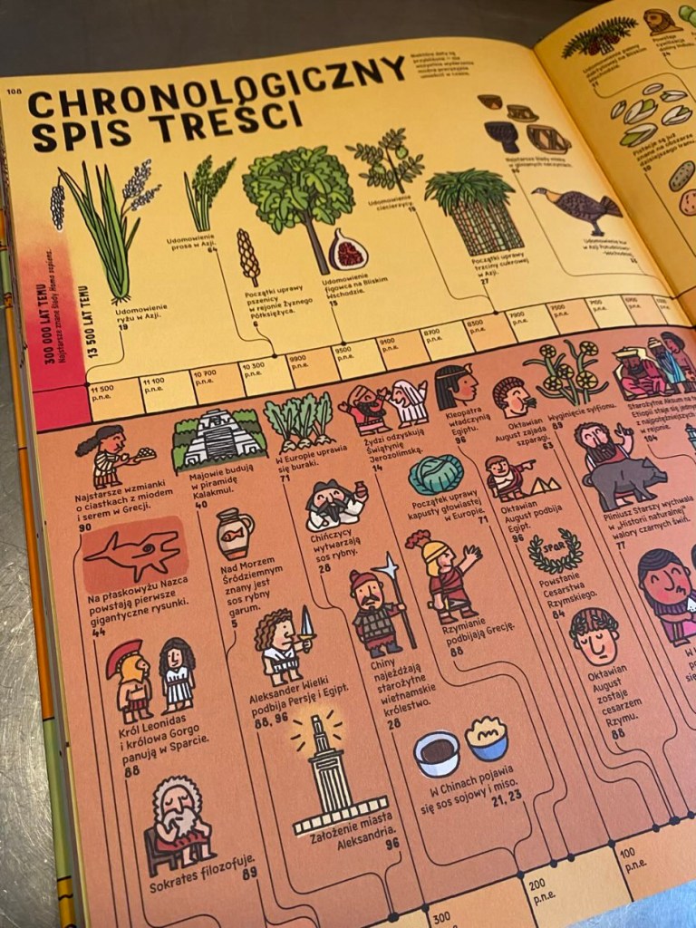 Na pierwszej stronie znajduje się mapka, dzięki której łatwo przeniesiemy się do wybranego kraju. Zaraz potem jest spis przepisów, a na końcu książki chronologiczny spis treści w formie obrazkowej oraz indeks pomagający szybko odszukać interesujące informacje.