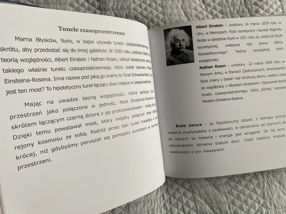 Autor zadbał także o wyjaśnienie naukowych tłumaczeń pewnych zjawisk, dołączył zdjęcia kosmosu i rysunki obrazujące np. zjawisko fotoelektryczne.