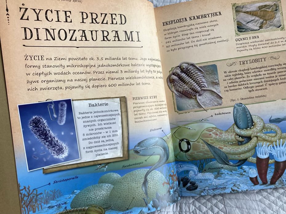 Ostatnie strony zostały poświęcone na przybliżenie czytelnikom rozwoju życia na Ziemi oraz źródeł naszej wiedzy na ten temat. Oś czasu w prosty sposób porządkuje informacje, pokazuje jak zmieniała się oraz rozwijała nasza planeta między epoką triasu i kenozoiku, jakie dinozaury i ptaki żyły w poszczególnych epokach oraz jak wyginęły dinozaury. Ciekawa jest także rozkładówka opisu skamielin.