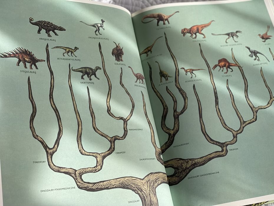 Książka rozpoczyna się rozgałęzionym drzewem (kladogramem), pokazującym obecną wiedzę na temat przodków gatunków dinozaurów.