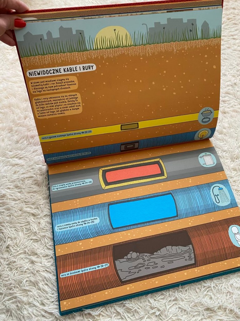 Ta publikacja edukacyjna posiada dwie poziome sekcje, połączone grzbietem. Młodzi czytelnicy z jednej strony mogą odkryć tajemnice ukryte pod warstwami Ziemi, a z drugiej, zalane wodą ciekawostki.