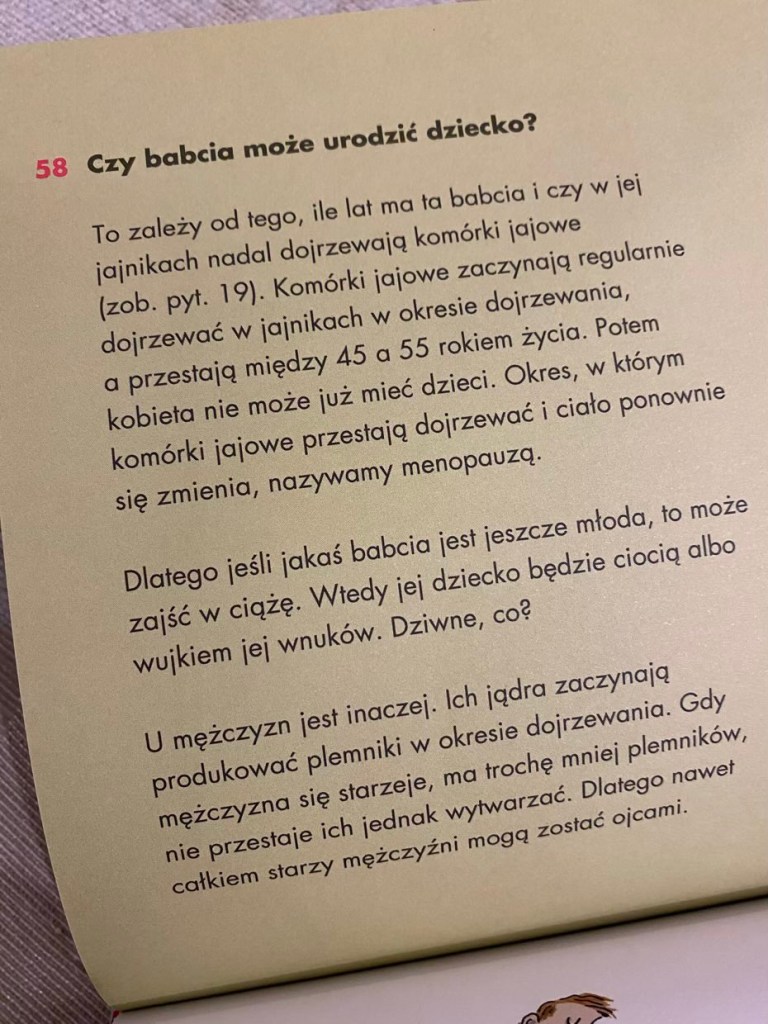 Większość odpowiedzi ma długość 1-2 akapitów, a kilka ma listy punktowane. Każdy temat zawiera wystarczającą ilość informacji, aby odpowiedzieć na pytania, które może mieć dziecko, bez zbytniego wchodzenia w szczegóły techniczne. Wydawnictwo zadbało o to, aby nazewnictwo występujące w książce było odpowiednie i społecznie akceptowane oraz należące do terminologii medycznej.