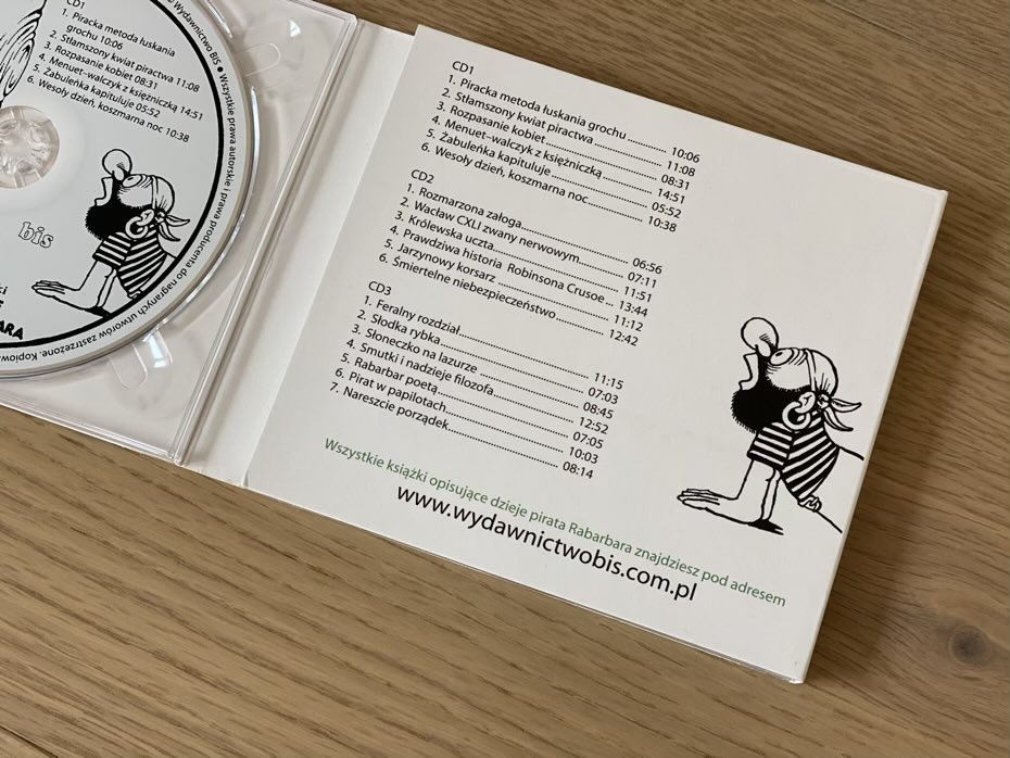 Nasz 6.5-letni synek, Adaś, słucha “Rabarbara” na okrągło. Podczas każdego przejazdu samochodem, choćby na chwilę, musimy słuchać tych bajek. Kilka razy w tygodniu jeździmy samochodem na krótkie przejażdżki. Co jakiś czas jedziemy 1-2h (oczywiście nadal słuchając bez przerwy), a pomimo tego Adasiowi ciągle mało. Nawet wracając do domu, często musimy dalej słuchać tych bajek. Bywa, że Adaś przegląda sobie w domu książeczki, jednocześnie słuchając “Rabarbara” i po chwili okazuje się, że książeczki tak naprawdę już tylko leżą obok, ponieważ nasze dziecko jest całkowicie pochłonięte opowiadaniem. Dodam jeszcze, że około tego okresu Adaś dopracował do perfekcji wymowę literki “r”, z którą nie ma najmniejszego problemu. Wymawia ją tak wyraźnie, że nas, rodziców, aż rozpiera duma. Kto wie, czy nie dopomogło tu częste słuchanie i powtarzanie imion bohaterów: Pirat Rabarbar, żona Barbara, synek Krztynek i siostra Pir-Ania, zwłaszcza wymawiane przez piracką papugę, z dużym naciskiem na “r”: Pirrrrrat Rrrrrabarrrrrbar.