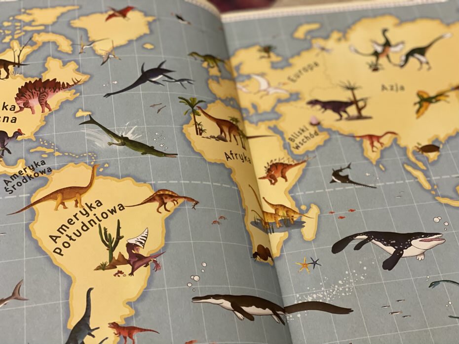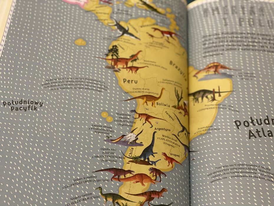 Książka zabierze czytelnika w podróż przez sześć kontynentów, na których znajdziemy pogrupowane tam dinozaury.
