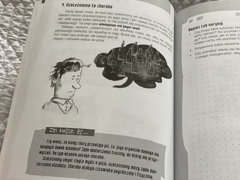 Bardzo istotne okazują się zróżnicowane ćwiczenia, które mają służyć konkretnym celom, jak uzmysłowienie sobie pewnych treści lub uporządkowanie myśli, uczuć czy zachowań. Co ważne autorka chce wyjaśnić młodemu czytelnikowi, że ktoś, kto pije, nie przestaje kochać, tylko zupełnie nie potrafi tego okazać. Jego chory umysł na pierwszym miejscu stawia alkohol, więc dziecko może się czuć opuszczone.