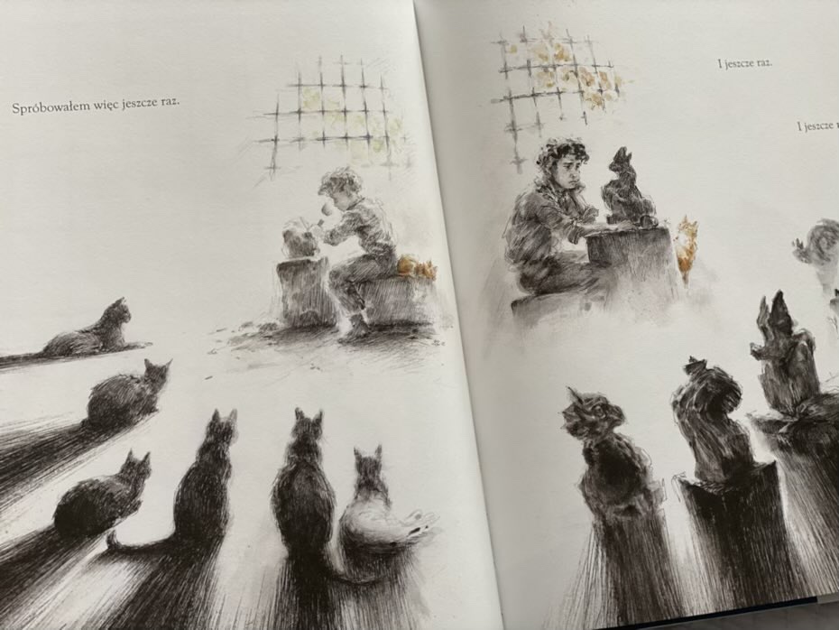 Czarno-białe ilustracje są hipnotyzujące. Brak koloru sprawia, że książka jest trochę klasyczna i choć niektóre konkretne fragmenty wydają się niczego nie przedstawiać, to przy bliższym przyjrzeniu się można dostrzec w nich wszelkiego rodzaju zwierzęta, formy i postacie.