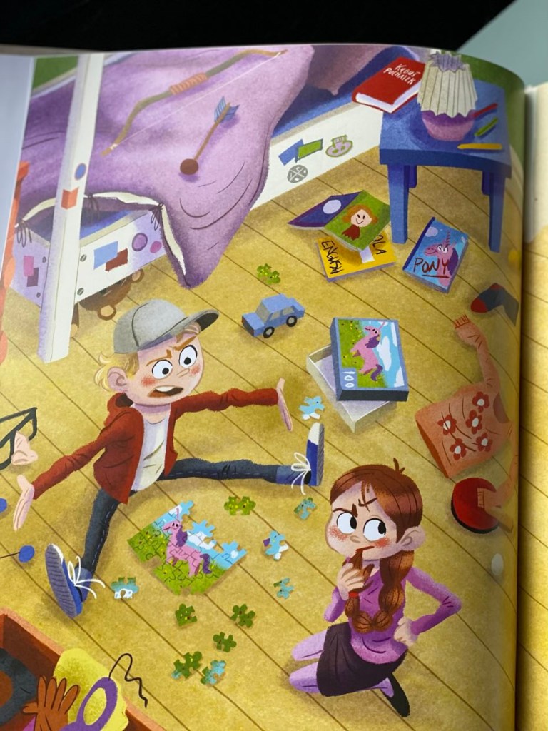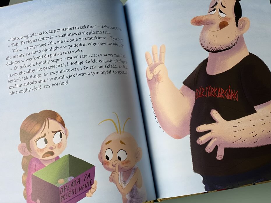 „Tata Oli przeklina” to kolorowa i zabawna historia rodziny, którą znamy z poprzednich części. Myślę, że rozwiązanie – pudełko na pieniądze za przeklinanie – to wspaniałe rozwiązanie w domach, gdzie brzydkie słowa wymykają się z ust. U nas w domu unikamy jak ognia wyrażeń, na które latorośl ma jeszcze czas. Zdarzały się sytuacje, że w niektórych książkach pojawiały się „niewłaściwe” wyrazy, ale my je zawsze pominęliśmy, zamieniliśmy lub po prostu zostały przyklejone karteczką z innymi wyrazami. W przypadku tej książki jest podobnie.