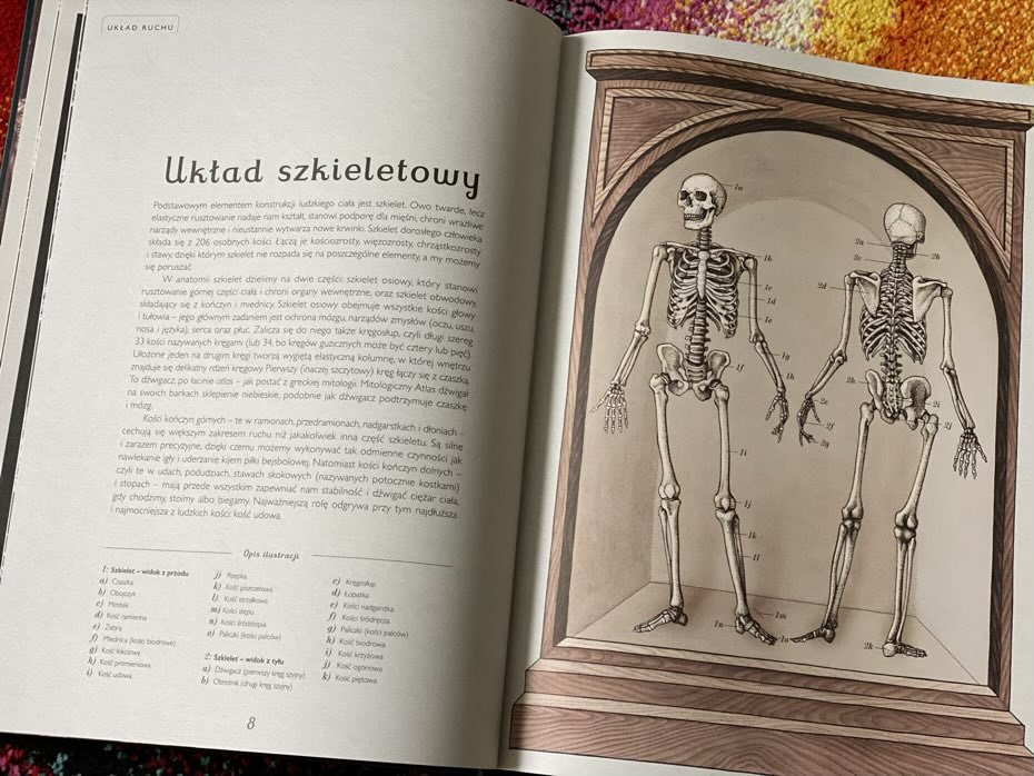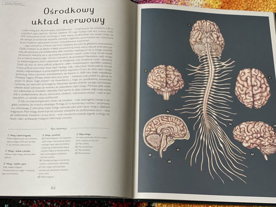 Ta dużych rozmiarów i przede wszystkim fascynująca lektura, zabiera czytelników na wycieczkę po ludzkim ciele. Dzięki tej książce dzieci dowiedzą się jak działają główne systemy organizmu, od maleńkich mięśni, używanych do przekazywania emocji, po mózg, z opisem jego precyzyjnego działania. Tytuł ten szczegółowo omawia siedem układów wewnętrznych: mięśniowo-szkieletowy, sercowo-naczyniowy i oddechowy, pokarmowy i moczowy, nerwowy i zmysły specjalne, odpornościowy i limfatyczny oraz hormonalny i rozrodczy.