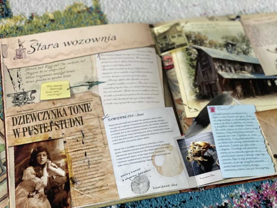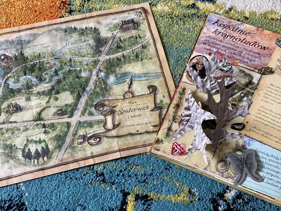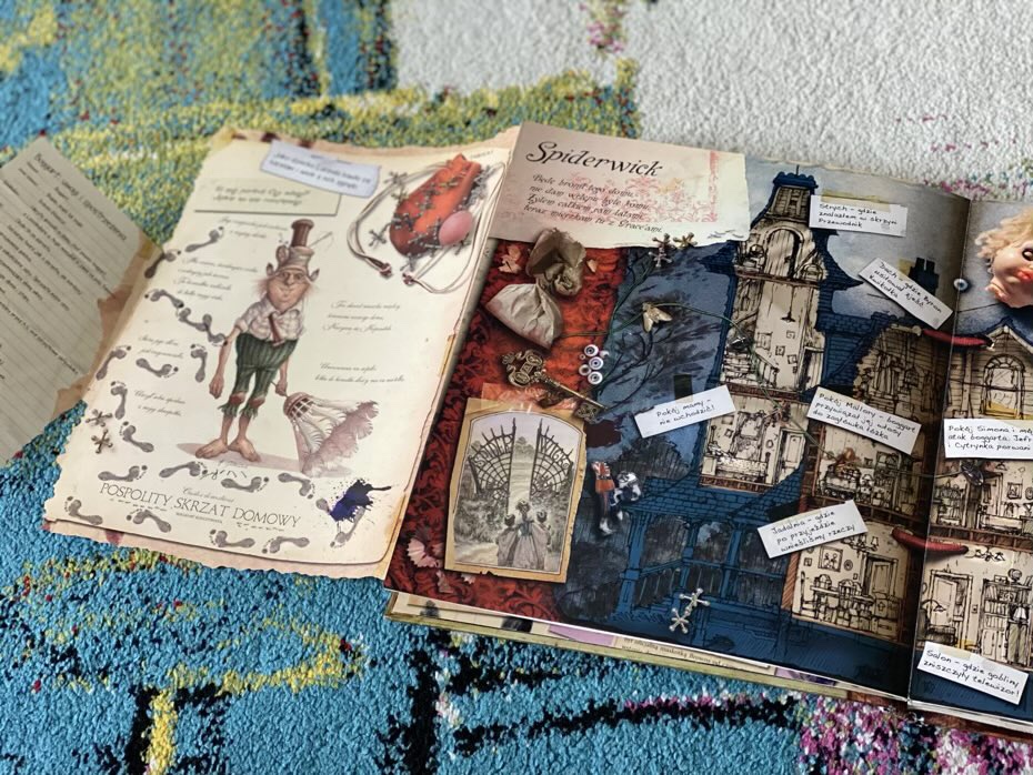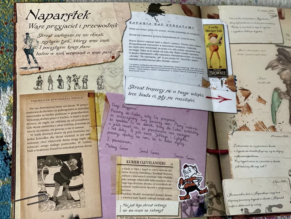 Na stronach znajdziemy kilka fajnych klapek do otwierania i kieszonek, w których można znaleźć rzeczy, takie jak mniejsze książeczki czy mapę Spiderwick i okolic. Niestety, nie potrafię powiedzieć co powinno się znaleźć w niektórych kopertach (brakuje w nich zawartości), gdyż ten egzemplarz kupiłam z drugiej ręki. Adaś przepada za stworkami, potworkami, skrzatami itd., dlatego ten tytuł musiał pojawić się u nas w domu.