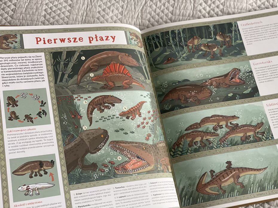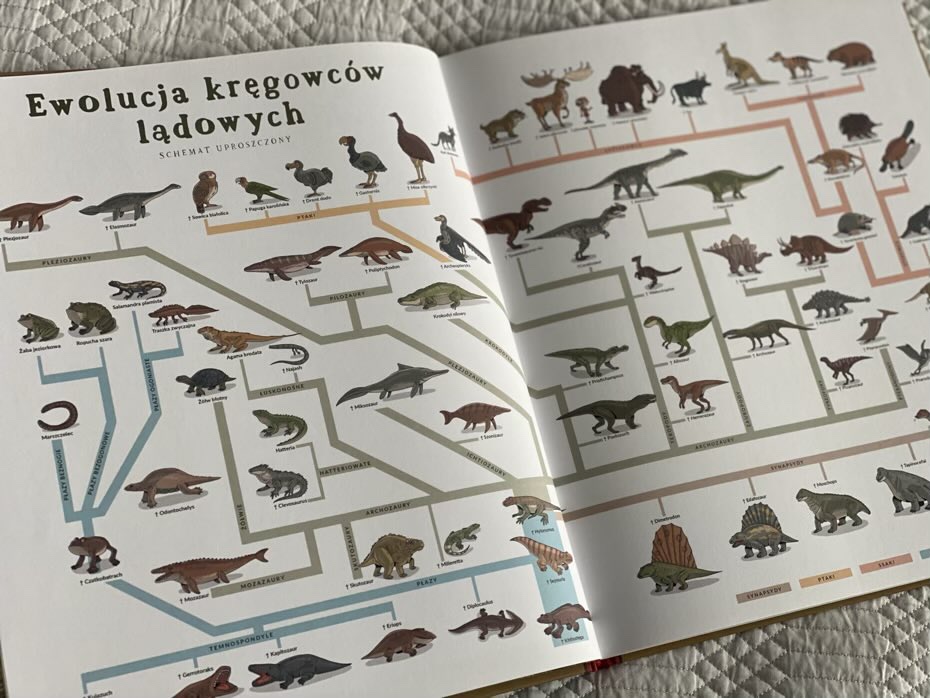 Zaraz po otwarciu pierwszych stron, szybko możemy przejrzeć spis treści, a następnie przyglądnąć się rozkładówce pokazującej czytelnikom drzewo genealogiczne i pojawiające się na nim zmiany, które zachodziły w świecie zwierząt oraz dlaczego w pewnym stopniu jesteśmy dalekimi kuzynami mamutów, czy kotów domowych.