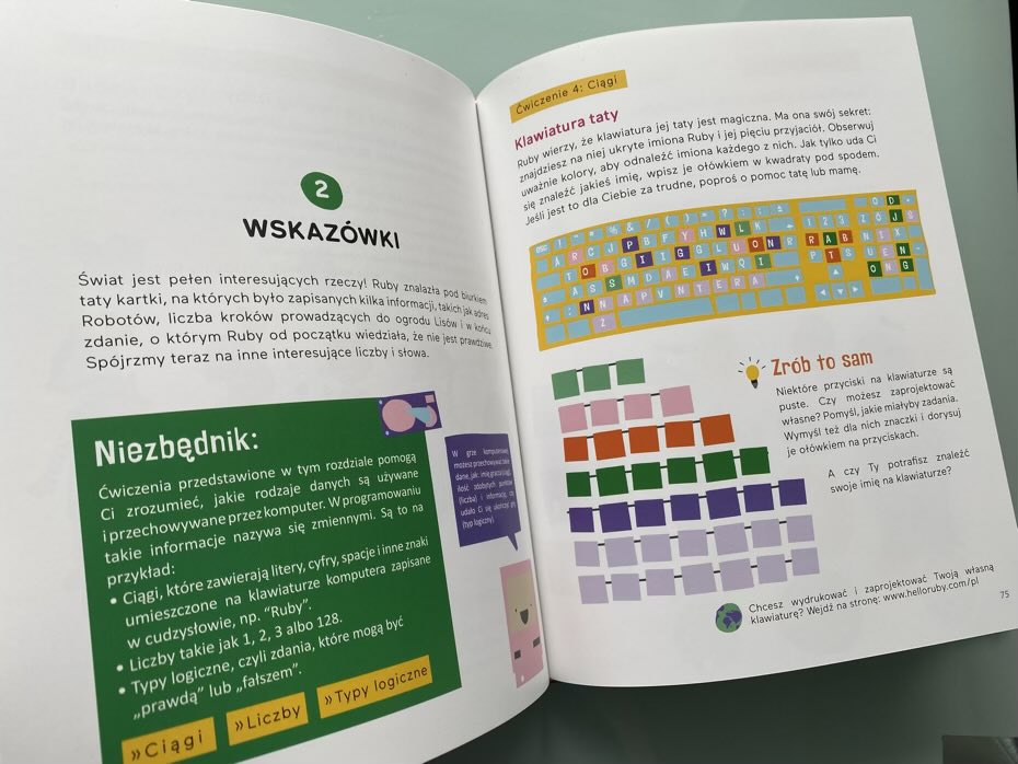Poza tą publikacją istnieje także strona internetowa: http://www.helloruby.com/pl, na której znajdziemy wiele pomysłów na zabawy i materiałów do wydrukowania. Można także oglądać wiele projektów stworzonych przez najmłodszych z całego świata, które rozpoczęły przygodę z programowaniem.