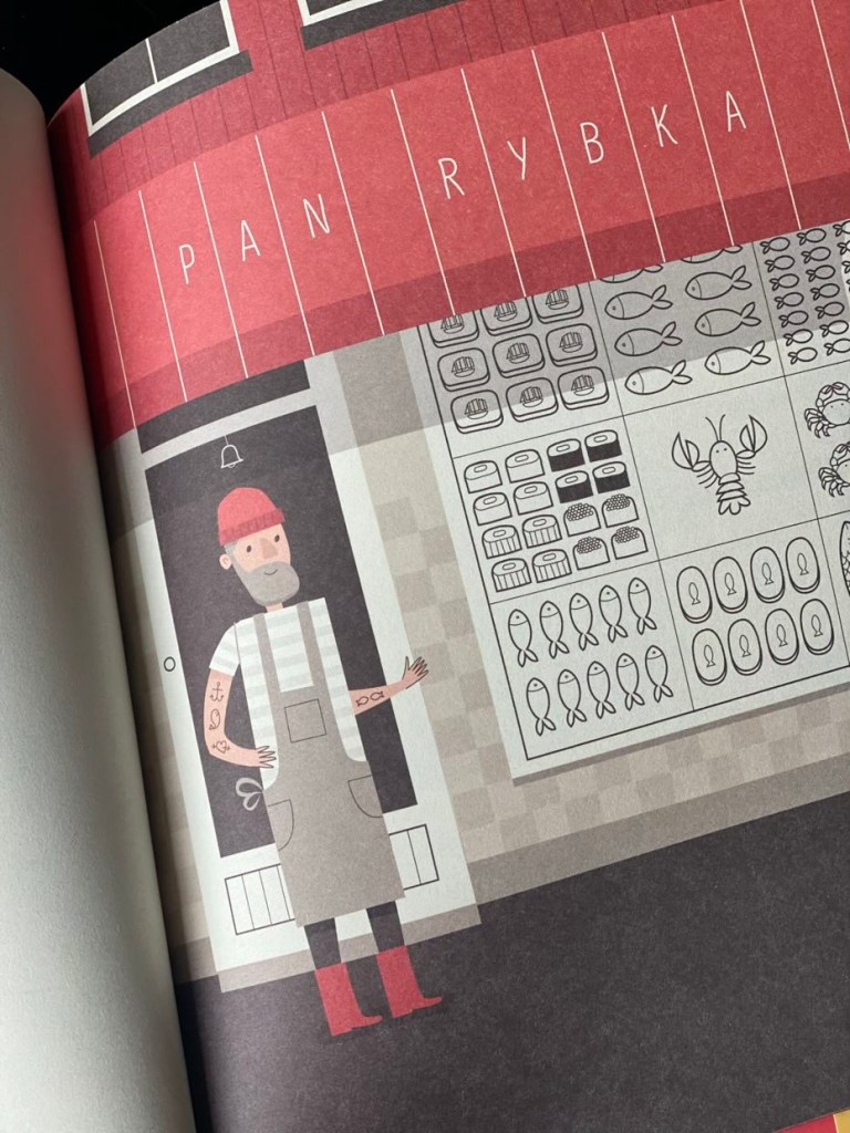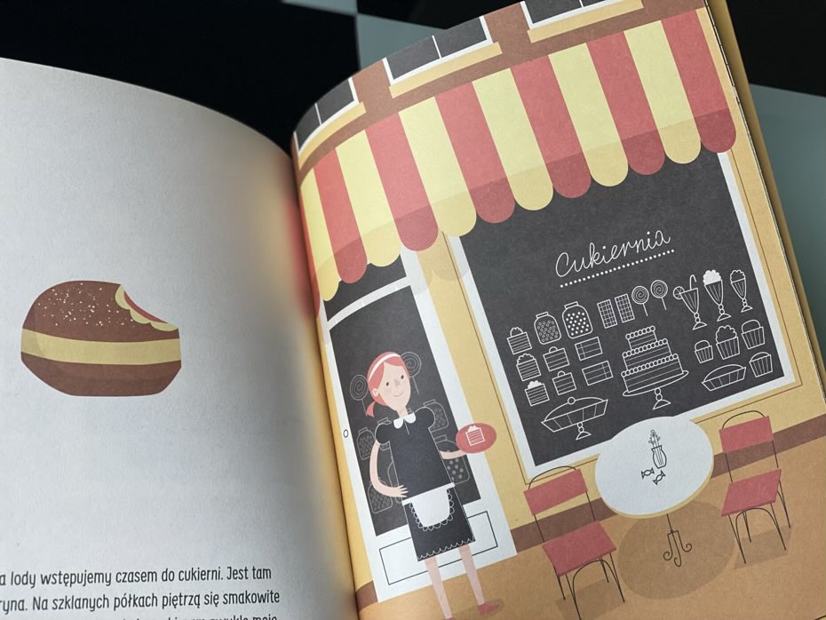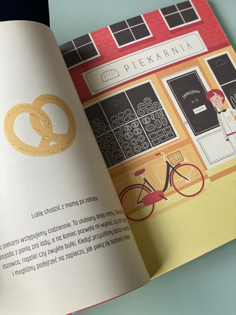 Dodatkowym atutem książeczki jest jedna z jej ostatnich stron. Znajdziemy tam kontury sklepu, który zaprasza małego czytelnika, by ten, korzystając z własnej wyobraźni, stworzył charakterystyczne elementy swojego ulubionego sklepu. Takie kreatywne zaangażowanie pociechy, połączone z poznaniem swojej okolicy to zabawa, która pobudzi małe główki do odkrywania tego, co doświadczyły.