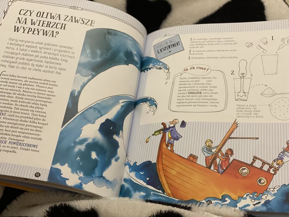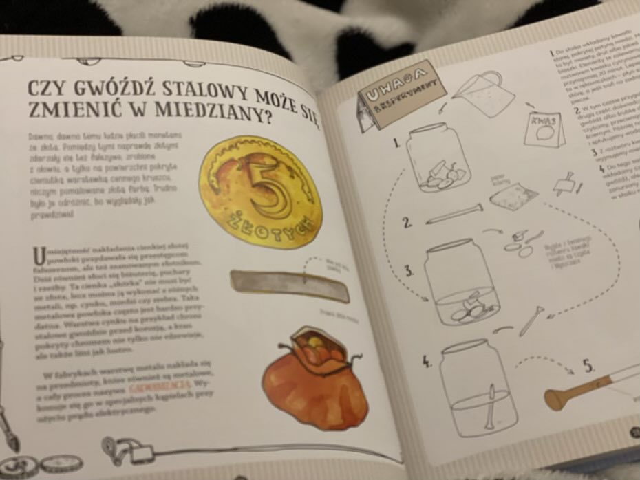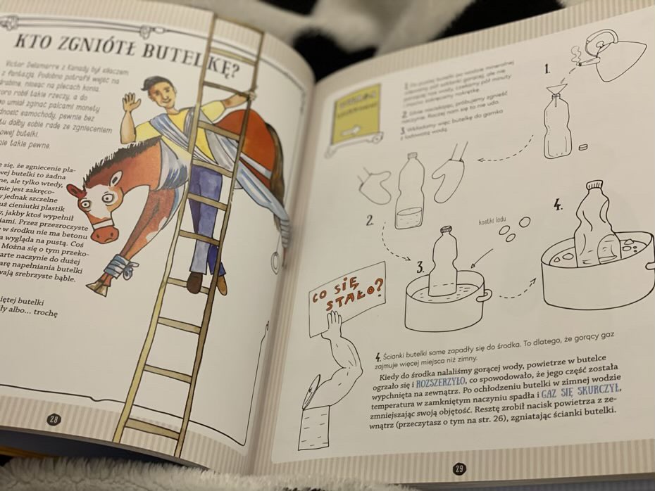 Dzięki zgromadzonej wiedzy mali i duzi badacze poznają zasady zjawisk istniejących w przyrodzie. Do tego samodzielnie eksperymentując, znajdą sprytne sposoby na to, jak z dala od rzeki czy jeziora zdobyć wodę, bez trudu zgnieść zakręconą plastikową butelkę lub zamienić stalowy gwóźdź w miedziany. Dowiedzą się też, dlaczego wnętrze czajnika przypomina jaskinię, w jaki sposób czarny węgiel czyści wodę, po co dawniej podczas sztormu wylewano oliwę do morza i wielu innych ciekawych rzeczy.