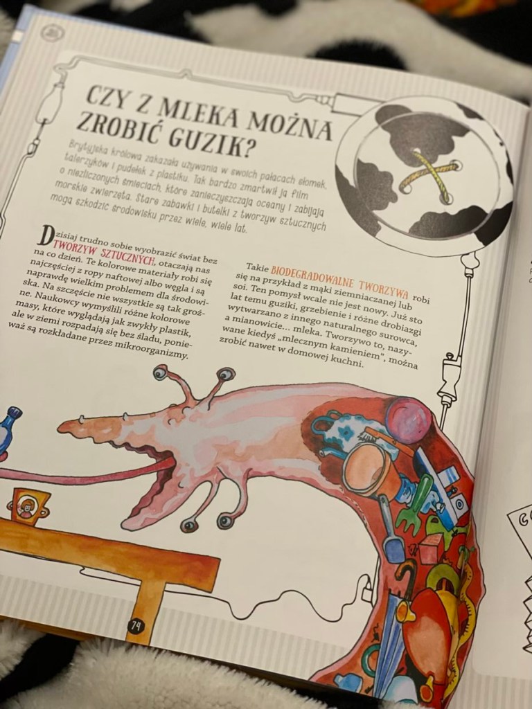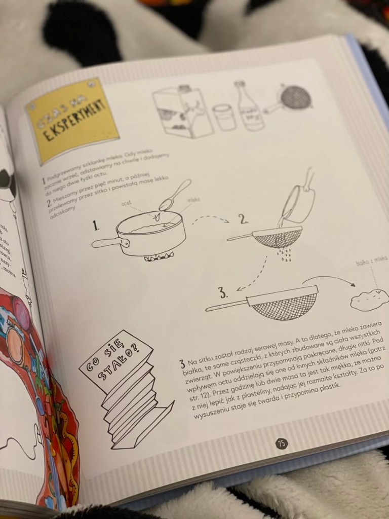 „Guzik z mleka. Czyli fantastyczne eksperymenty dla ciekawych świata” to publikacja napisana zrozumiałym dla każdego językiem i zilustrowana zabawnymi rysunkami.