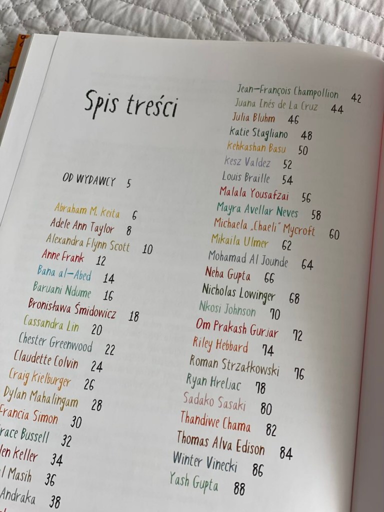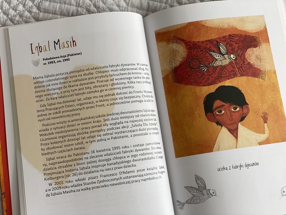Karolina Grabarczyk zestawiła ze sobą historie 42 dzieci pochodzących z różnych czasów i odmiennych części globu. Każda postać jest krótko i zwięźle opisana, ogranicza się do sedna przekazu i do najważniejszych rzeczy, jakich dokonała dana osoba. Natomiast każdy z bohaterów został przepięknie sportretowany przez Nikę Jaworowską.