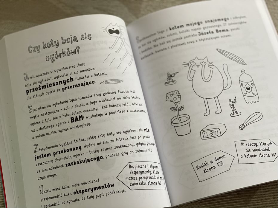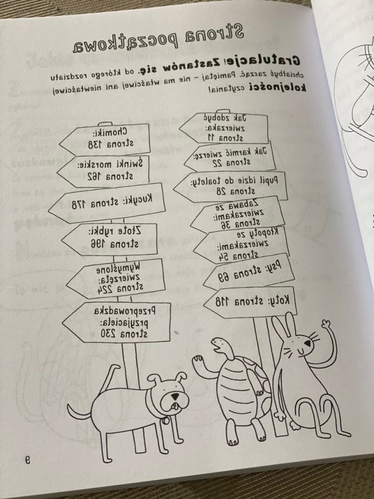 Czego jeszcze dowiemy się z lektury? Choćby tego, w jaki sposób dziecko może namówić rodzica na własne zwierzątko. Poznamy tu wymyślone rodzaje kotów i psów. Przeczytamy o kuwetach, obsikiwaniu słupów, zabawach z pupilem, o tym, co zwierzaki lubią, a czego lepiej nie próbować. Dowiemy się także o bezpiecznych i niezwykle etycznych eksperymentach, które można przeprowadzić na zwierzętach. Większość informacji jest niepraktyczna, ale jednocześnie uświadamia najmłodszym z czym wiąże się posiadanie własnego zwierzaka i opieka nad nim.