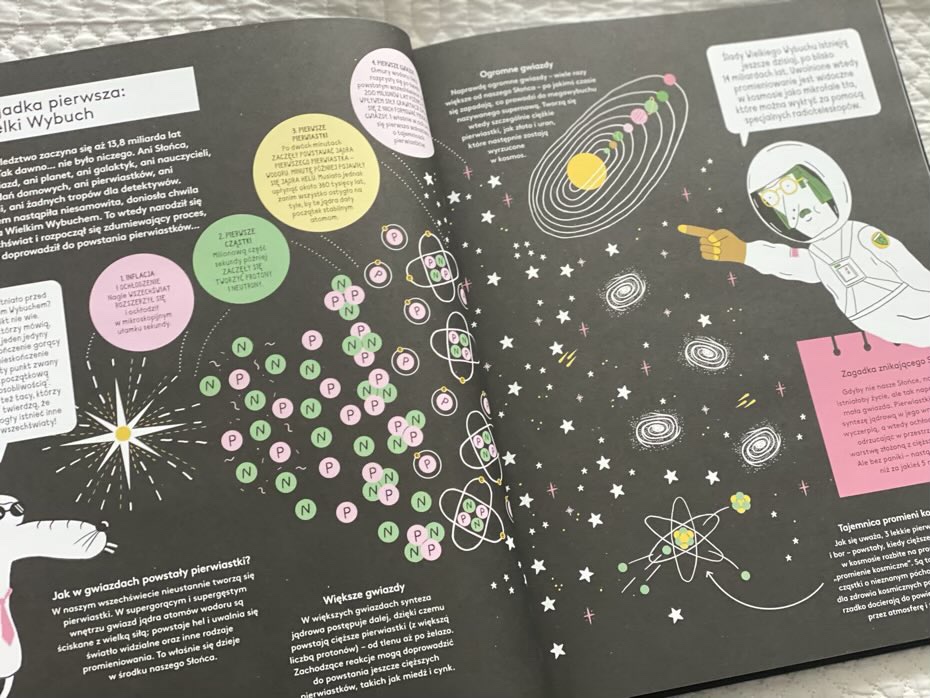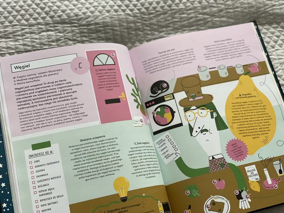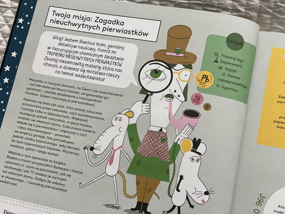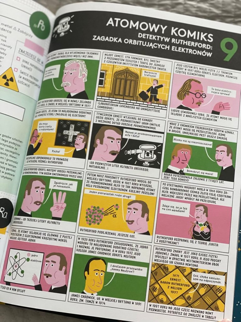 Na początku książki szczegółowo zostały omawiane pierwiastki, atomy, układ okresowy pierwiastków i nie tylko, aby pomóc młodym odbiorcom zrozumieć znaczenie informacji o każdym z pierwiastków. Muszę przyznać, że zbiór wiadomości jest świetny: jest historia, ostrzeżenia o niebezpieczeństwie i kryptonimy niektórych elementów, eksperymenty do wypróbowania (pod ścisłym nadzorem dorosłych) oraz komiksy, w których często występują naukowcy związani z chemią.