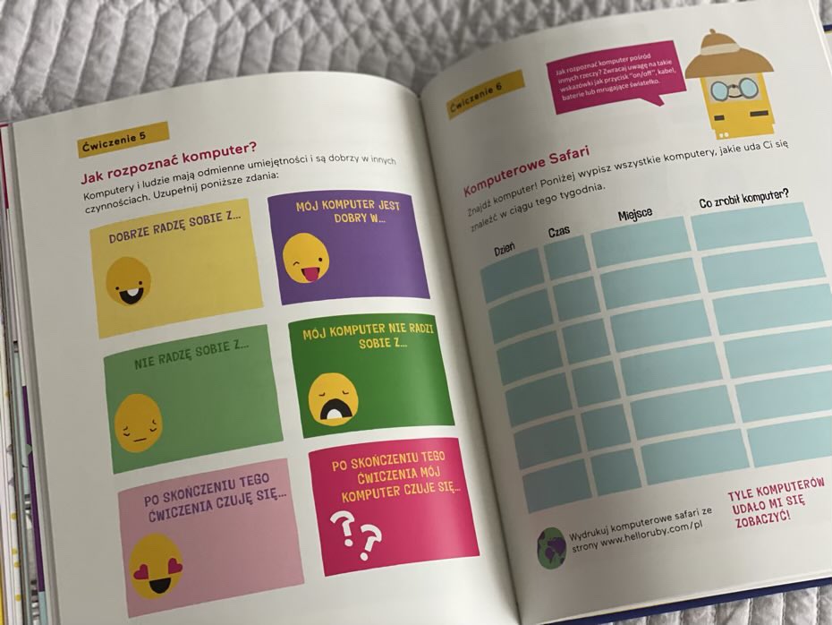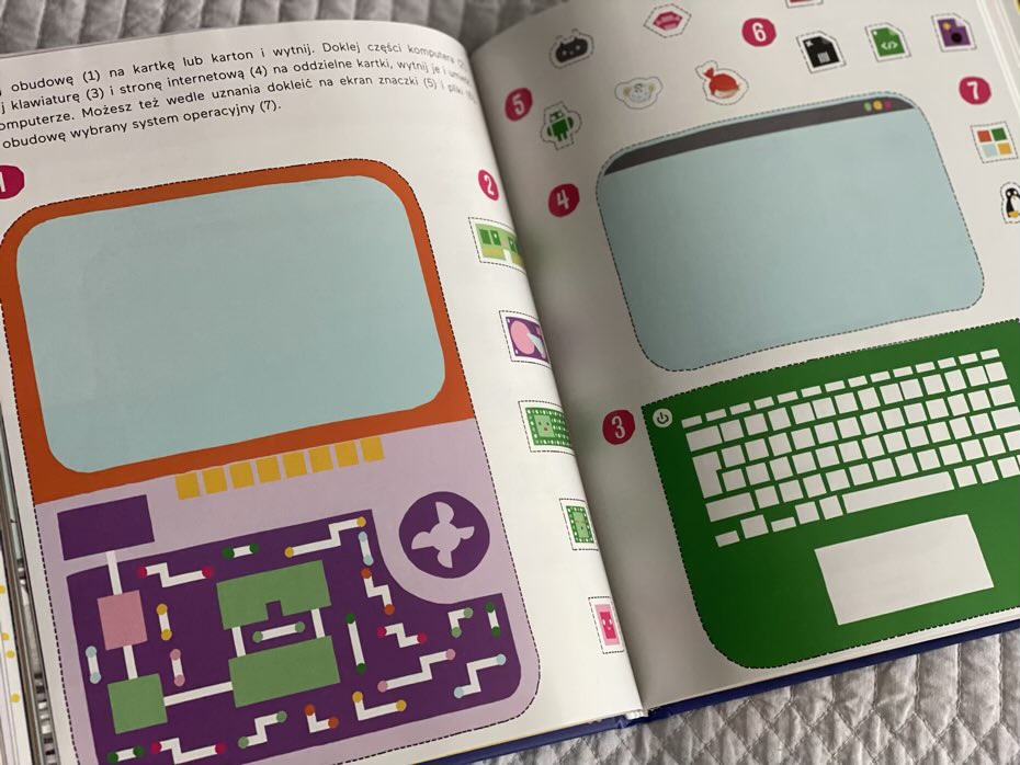 W części ćwiczeniowej dzieci będą mogły między innymi stworzyć swój komputer przy użyciu dołączonych naklejek, system operacyjny czy wtyczkę zasilającą maszynę.